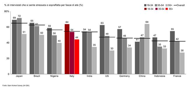 I giovani sono sottoposti a una crescente tensione psicologica che si riflette nella loro vita lavorativa. Se questo trend si manifesta in maniera diffusa in tutte le geografie prese in considerazione, l’Italia è sul podio, dopo Giappone e Brasile: il 64% dei lavoratori italiani sotto i 35 anni intervistati si sente sopraffatto o sotto stress, mentre solo il 54% degli over 35 e il 44% degli over 55 cita lavoro e stabilità economica come elementi di preoccupazione.