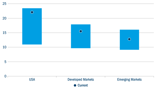 Fonte: Columbia Threadneedle, sulla base delle stime IBES. Il grafico mostra i livelli massimi/minimi/attuali dei P/E globali nel periodo 10/2011-10/2021. I P/E sono calcolati utilizzando i seguenti indici: USA: MSCI USA Index, pensato per misurare la performance dei segmenti large e mid cap del mercato statunitense. Mercati sviluppati: MSCI Europe, Australasia, Far East (EAFE) Index, un indice ponderato per la capitalizzazione di mercato che replica il rendimento totale delle azioni ordinarie di 21 paesi sviluppati. Mercati emergenti: MSCI Emerging Markets Index (EMI), un indice ponderato per la capitalizzazione di mercato corretta per il flottante, concepito per misurare la performance delle azioni nei mercati emergenti globali. Non è possibile investire direttamente in un indice.
