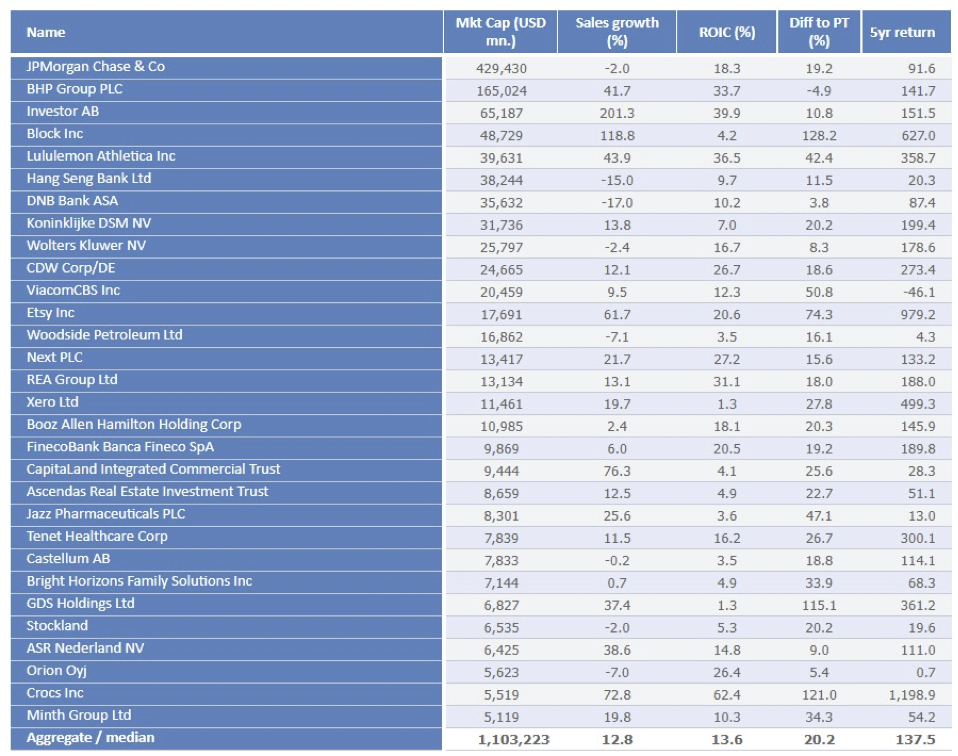 Le 30 società rappresentano $ 1,1 trilioni di valore di mercato con JPMorgan Chase che è la più grande. Ci sono pochi nomi a sorpresa sulla lista ma tra di loro vanno evidenziati il gigante minerario BHP Group e la società di esplorazione di petrolio e gas Woodside Petroleum. La crescita media dei ricavi in queste 30 società è del 12,8%, che è al di sopra della media del mercato, e il ROIC/ROE media è del 13,6%, leggermente al di sopra della media globale.