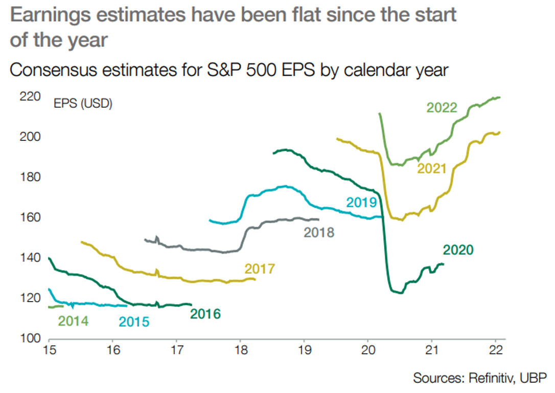 Il forte aumento dei rendimenti obbligazionari ha portato a un’attesa compressione del rapporto prezzo-utili, in particolare per le azioni USA. Lo spazio per un’ulteriore compressione dei multipli sembra ora più limitato. Tuttavia, le sorprese al rialzo sul versante dell’inflazione e/o i timori che l’inasprimento della politica monetaria abbia un impatto negativo sulle prospettive di crescita manterranno la volatilità, probabilmente, su livelli significativamente più alti dell’anno scorso.