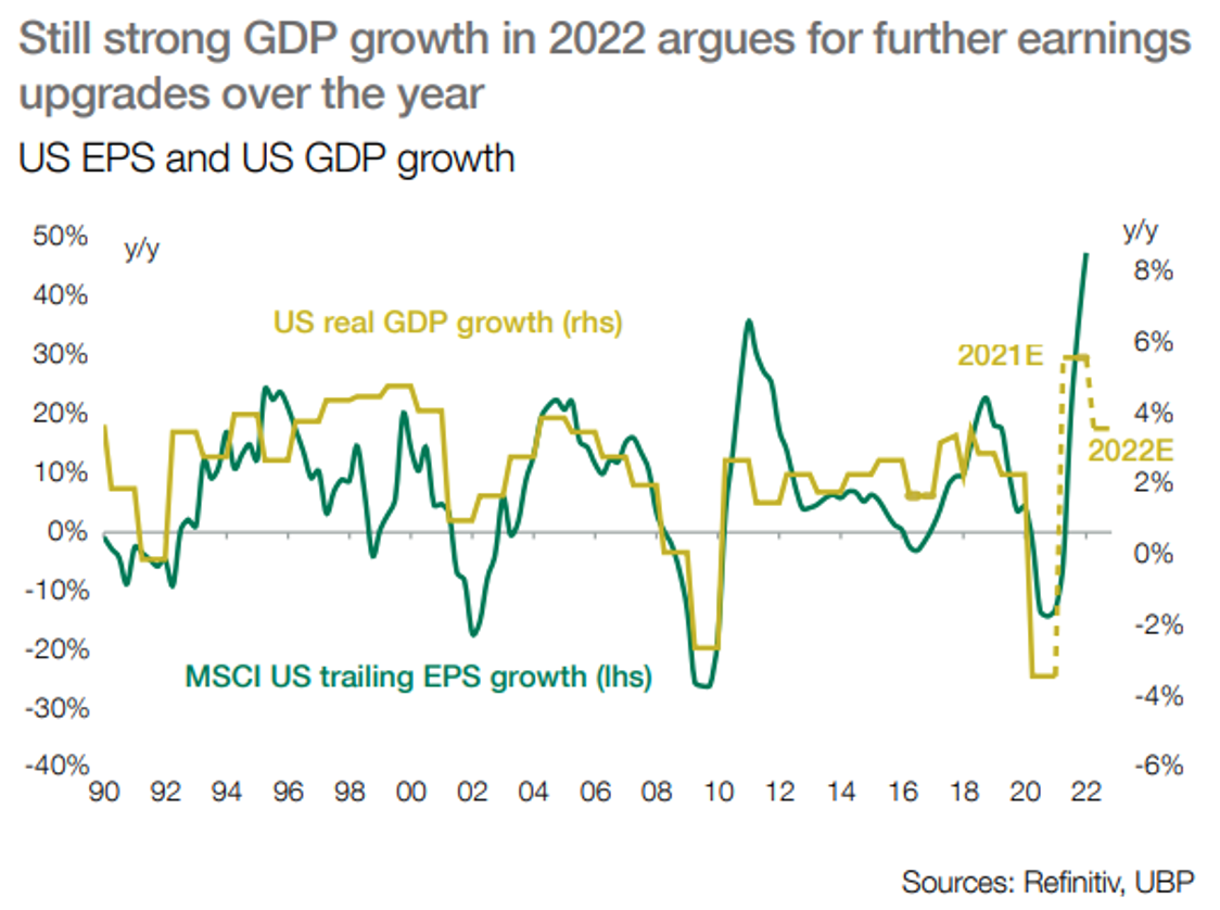 Grazie alla forte crescita nominale del PIL (di circa l’8% a livello globale), continuiamo a ritenere che le stime di consenso sulla crescita degli utili per azione di circa il 7%-8% abbiano un potenziale di rialzo in tutte le regioni. I costi di input sono significativamente più alti rispetto all’anno scorso, e la leva operativa sarà meno forte; tuttavia molte aziende dovrebbero poter continuare a rialzare i prezzi per conservare margini vicini ai livelli attuali.