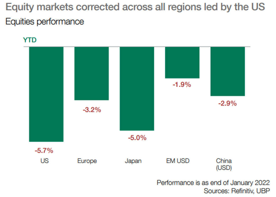 La svolta hawkish della Fed ha portato ad un brusco aumento dei tassi d’interesse reali, che a sua volta ha innescato il maggior ribasso sullo S&P 500 da settembre 2020; le aziende con valutazioni alte sono state le più penalizzate. Anche i titoli ciclici hanno sofferto per il timore delle conseguenze di un irrigidimento delle condizioni finanziarie sulle prospettive di crescita.