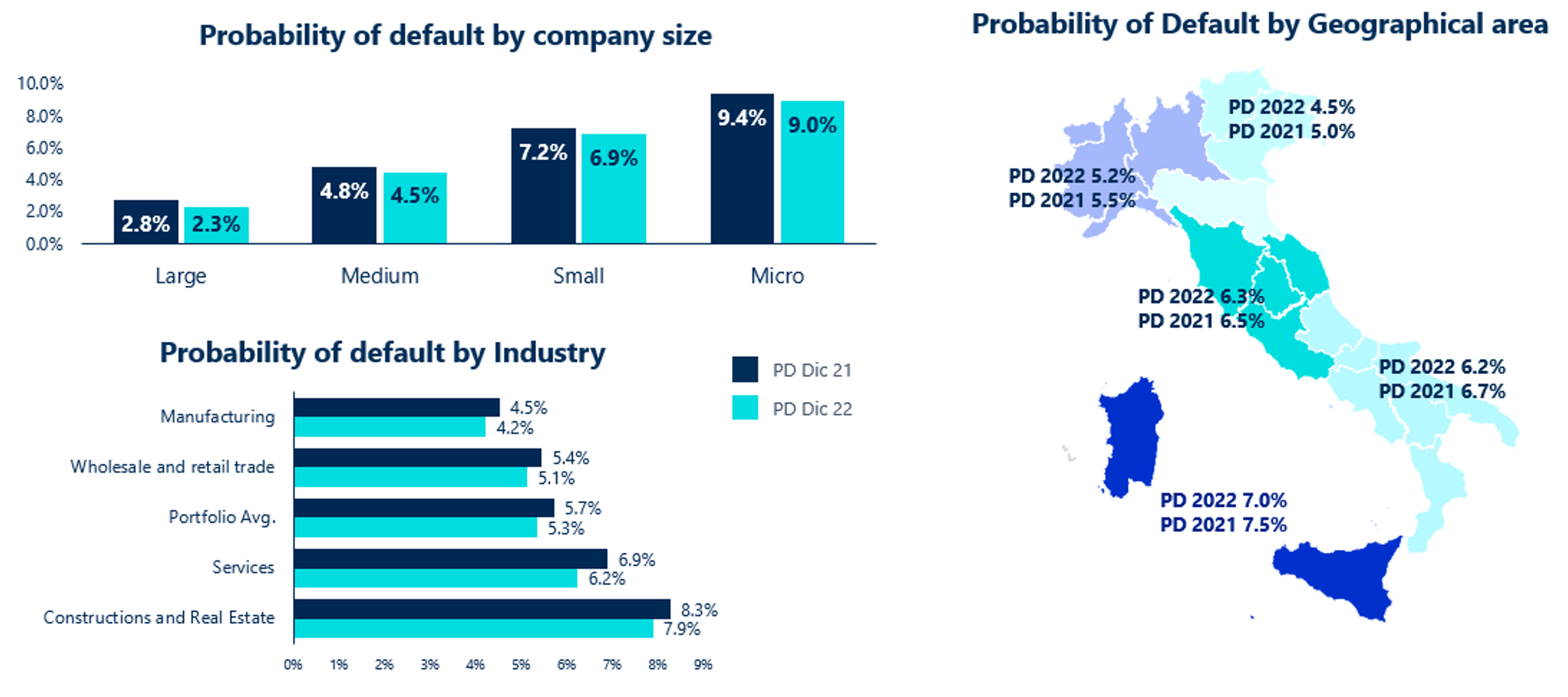 Considerando lo scenario base, o più ottimistico, le probabilità di default sono diverse per area geografica, con previsioni più confortanti per le regioni del Nord: il dato medio di PD per i prossimi 12 mesi nel Nord-Ovest si attesterebbe al 5.2% a fine 2022, mentre nel Nord-Est scenderebbe addirittura al 4.5%. Al Centro-Sud del Paese, invece, i valori di PD sarebbero pari al 6.3% al Centro e al 6.2% al Sud.