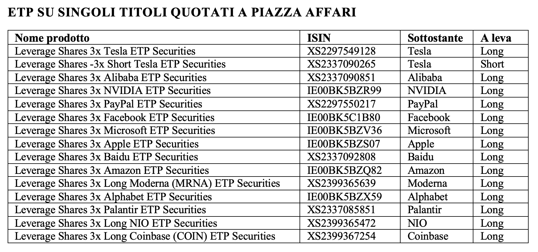 I prodotti quotati su Borsa Italiana – Leverage Shares esordisce sul mercato italiano con il lancio di 15 strumenti che consentono di prendere posizione con leva 3x su singoli titoli di aziende leader a livello globale nei settori tech, fintech, healthcare e automotive, tutti denominati in euro. Nel dettaglio i titoli sottostanti sono: Tesla (per la quale è prevista sia la versione long che quella short), Alibaba, NVIDIA, PayPal, Facebook, Microsoft, Apple, Baidu, Amazon, Moderna, Alphabet, Palantir, NIO, Coinbase. Gli ETP sono quotati a Piazza Affari a partire dal 16 febbraio.