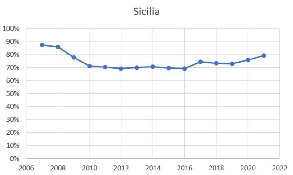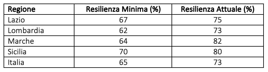 Delle quattro regioni, la Lombardia ha registrato il valore più basso di resilienza – 62% (nel 2010) – e attualmente anch’essa ha il valore più basso del 73%, dietro Lazio, Sicilia e Marche.