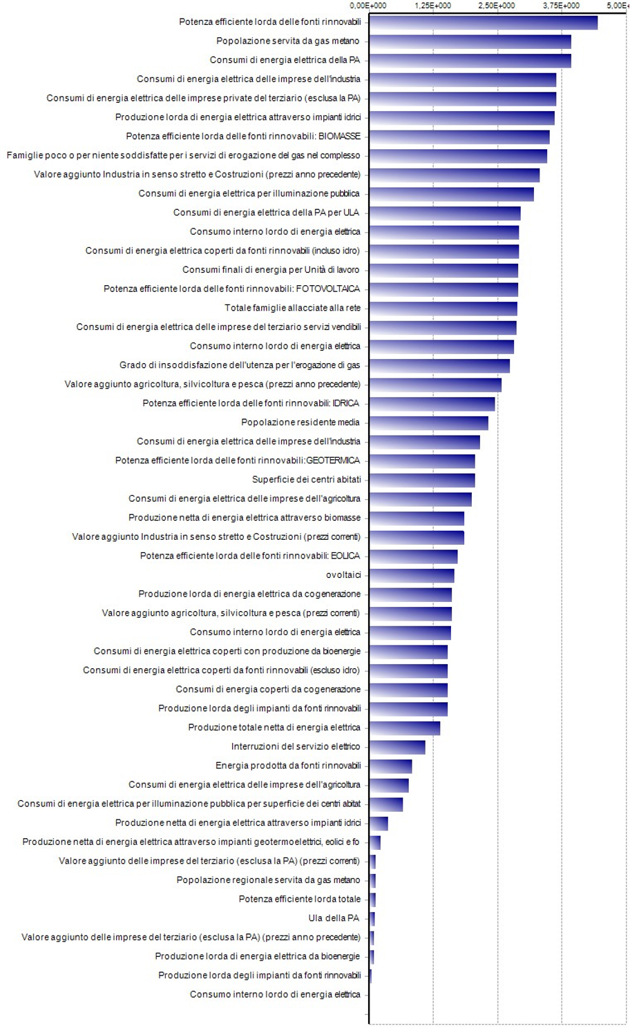 Infine, il grafico a barre sottostante, noto come Profilo di Resilienza, classifica i diversi parametri utilizzati per lo studio in termini del loro impatto sulla resilienza energetica dell’Italia nel suo complesso. Si può notare come le variabili dominanti siano relative all’uso di energie rinnovabili e all’utilizzo di gas metano. Il grafico mostra, in termini quantitativi, dove intervenire per rendere il sistema energetico nazionale (e regionale) più resiliente e quindi può aiutare a dirigere meglio la politica energetica del paese.