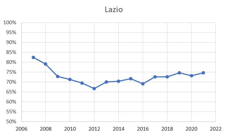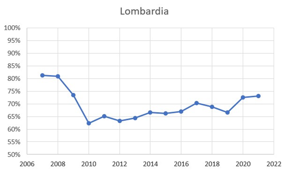 Delle quattro regioni, la Lombardia ha registrato il valore più basso di resilienza – 62% (nel 2010) – e attualmente anch’essa ha il valore più basso del 73%, dietro Lazio, Sicilia e Marche.