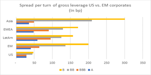 Il punto interessante è che: nonostante l’aumento della volatilità che abbiamo di recente sperimentato nei mercati emergenti (sulla scia di una molteplicità di fattori quali le tensioni in Russia e Ucraina, lo stress nella sfera immobiliare in Cina, la volatilità della lira turca a seguito di una politica monetaria non certo ortodossa ed I negoziati dell’Argentina con il FMI), i corporate degli emergenti pagano un livello più alto di spread per turn of leverage rispetto agli omologhi statunitensi in tutte le categorie di rating.