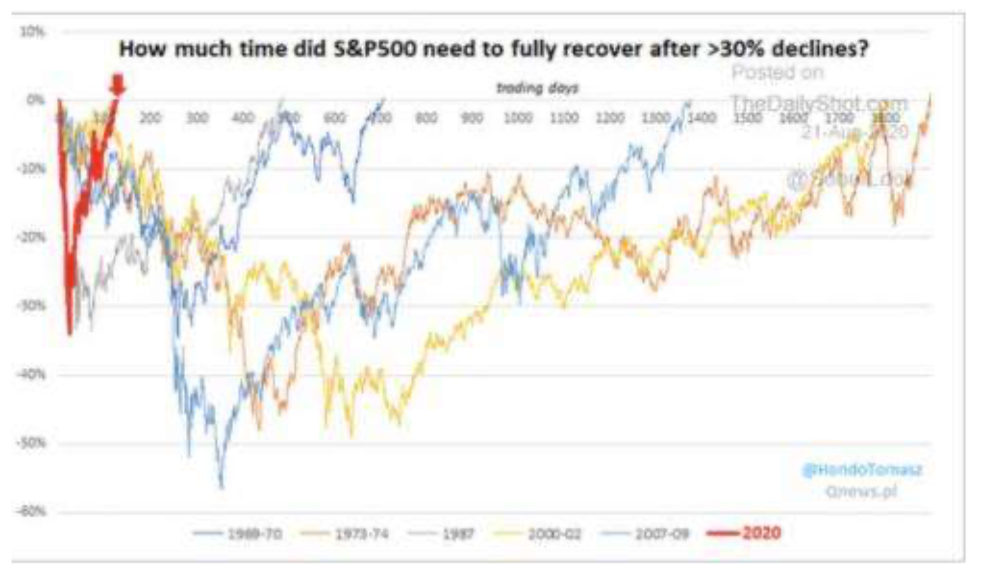 In secondo luogo, occorre notare come il mercato azionario statunitense si sia ripreso dalla recente crisi pandemica molto più rapidamente rispetto ai precedenti ribassi (Fig.2).