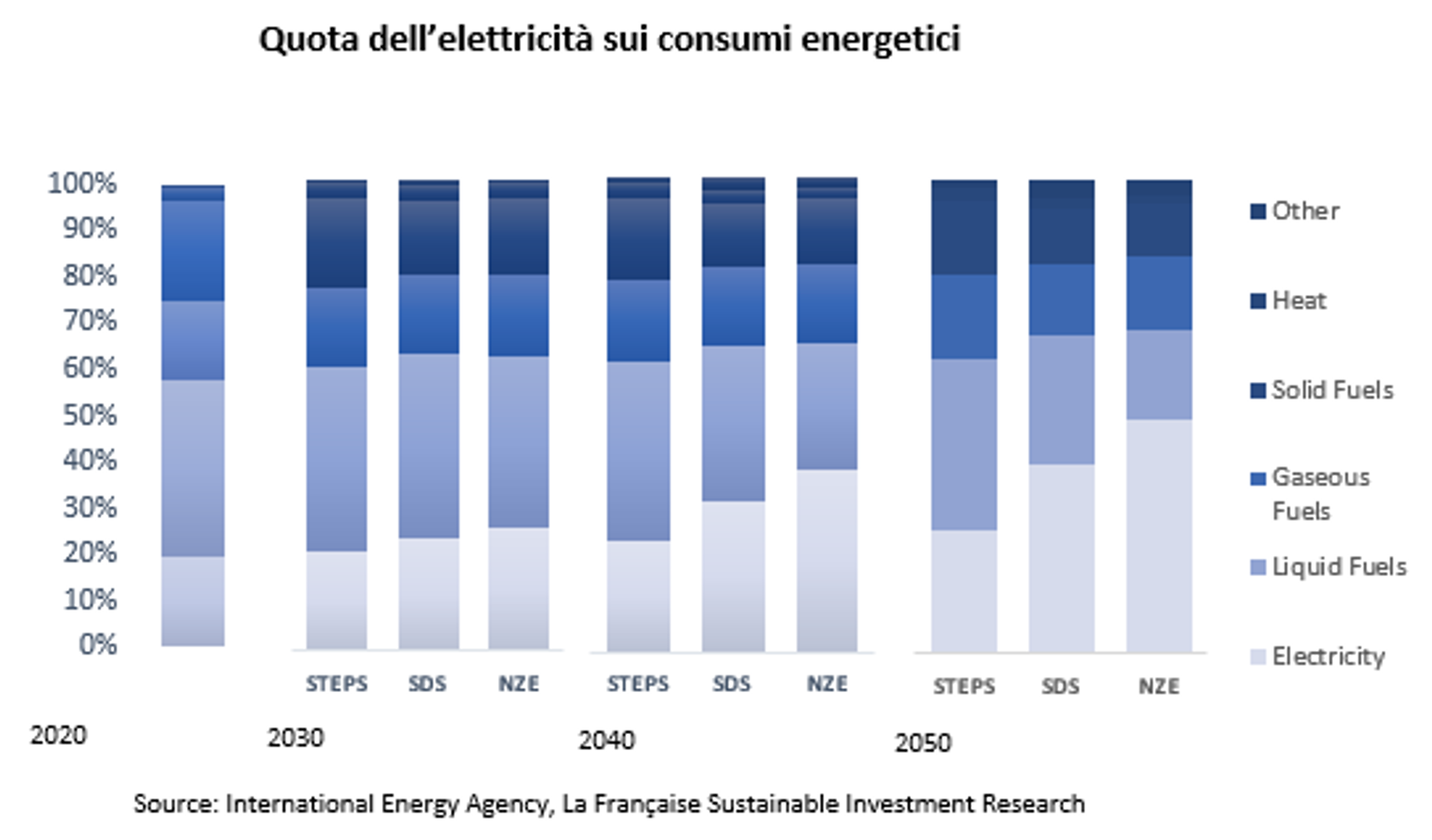 Questo passaggio sarà guidato da una chiara elettrificazione dell’economia. Dal 1990, la domanda di elettricità è cresciuta del 3% all’anno, ad eccezione del 2020, a causa dell’impatto del COVID-19. Guardando al futuro, sia nello “scenario di sviluppo sostenibile” (Sustainable Development Scenario) che nello “scenario zero emissioni entro il 2050” (Net Zero Emissions 2050), l’elettricità diventa il principale vettore energetico in tutti i settori. La decarbonizzazione dei settori dell’edilizia, dell’industria e dei trasporti richiederà un sistema tecnologico globale a basse emissioni di carbonio, che va dalle energie rinnovabili e dall’idrogeno pulito ai progressi dell’efficienza energetica e alla cattura e stoccaggio di carbonio (Carbon Capture Utilisation and Storage).