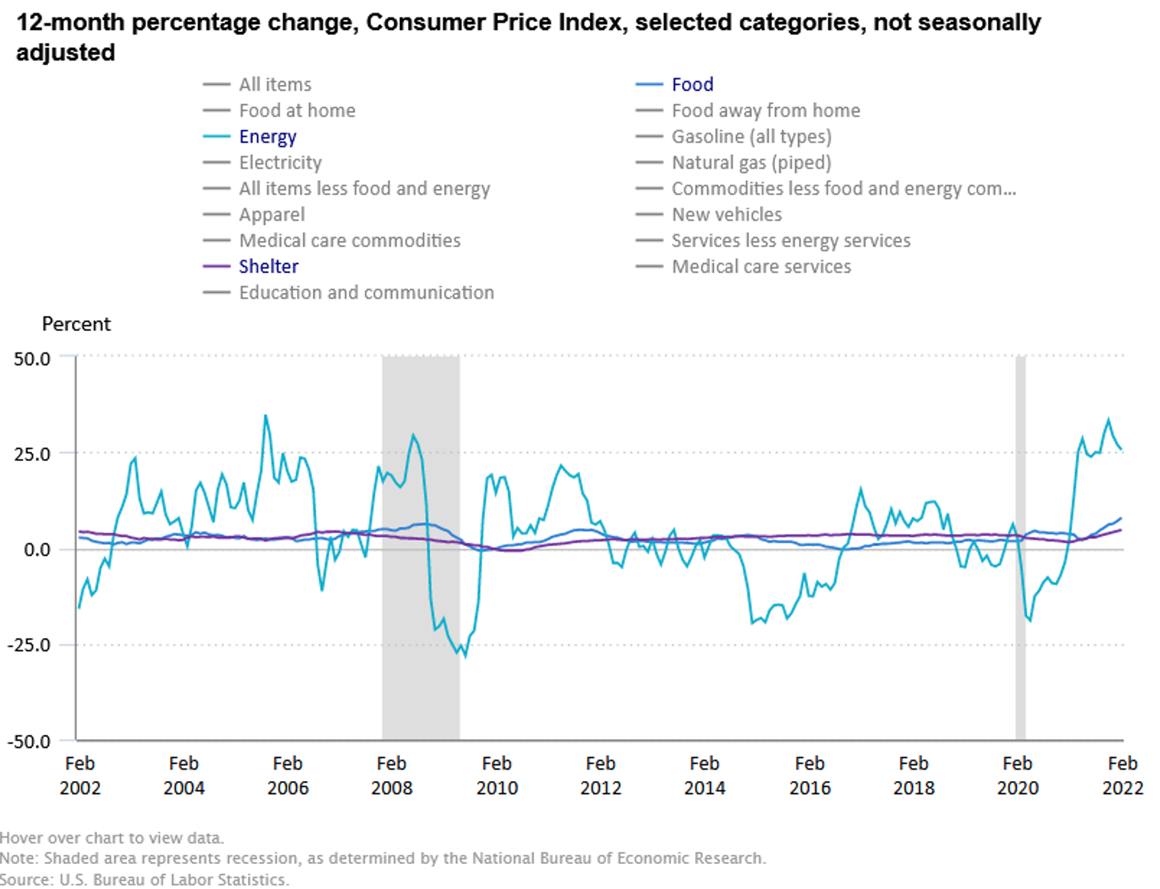 Nel frattempo, l’inflazione US di febbraio ha confermato le attese posizionandosi al 7,9%, massimo da 40 anni, trainata ancora dalla componente affitti (con peso oltre il 30% nel paniere) ed alimentari, insieme a quella energetica.