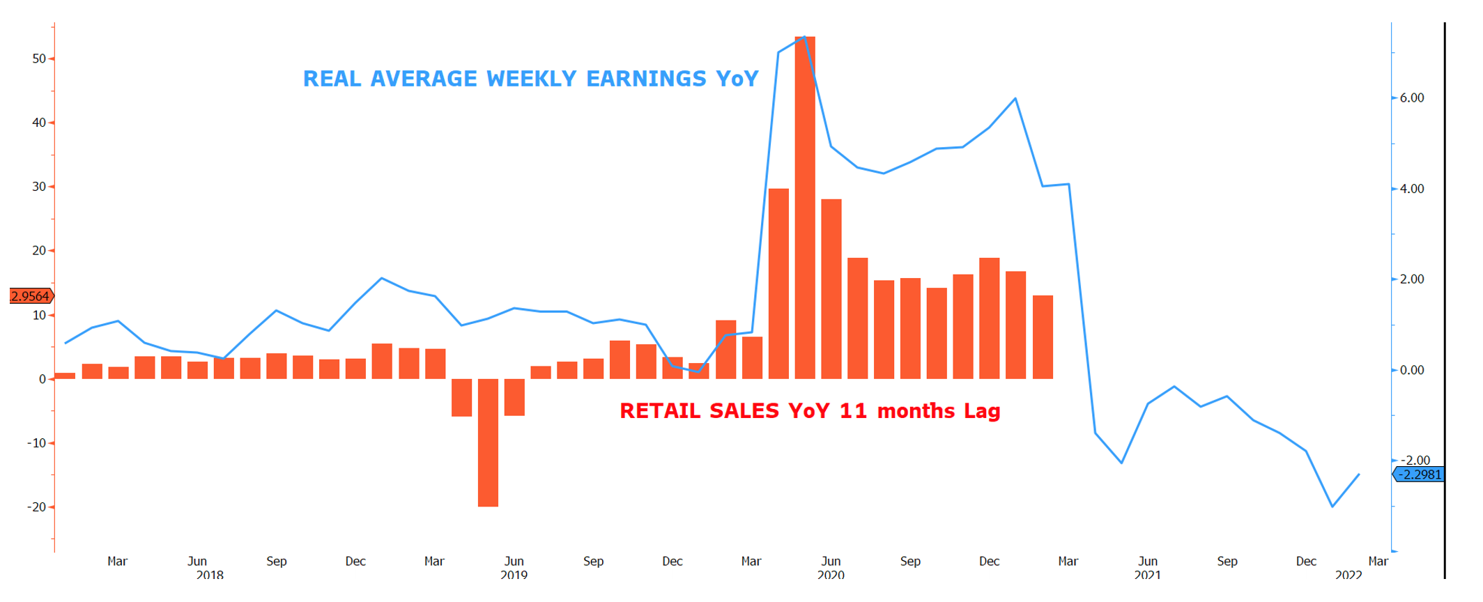 La Fed pertanto ha lavoro facile nel breve dal momento che dovrà agire solo sul fronte inflazione ma, tra qualche mese, anche negli Usa, si potrebbe aprire il dilemma di politica monetaria (cosa privilegiare, inflazione o crescita) in vista di un possibile rallentamento marcato della crescita, anticipato proprio dalla lunga fase (11 mesi consecutivi) di salari reali negativi.