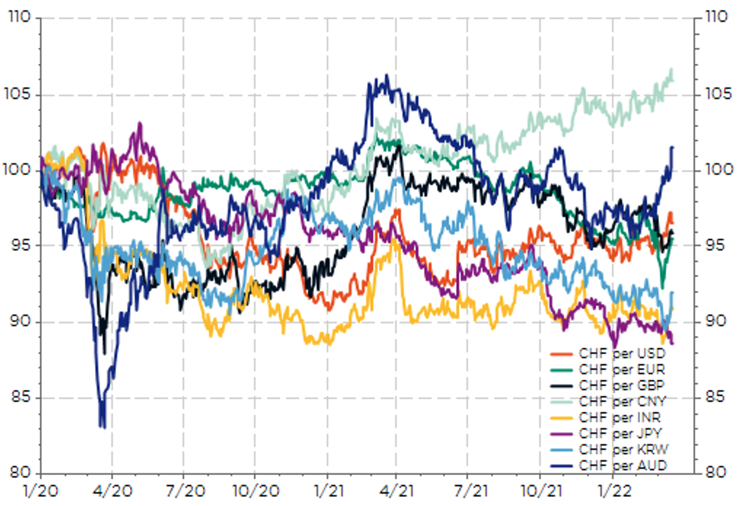 Mentre è chiaro che in Svizzera non vi sia fretta per un inasprimento della politica monetaria, il margine di manovra della BNS si sta comunque già riducendo… in particolare quando si tratta di lamentarsi e cercare di combattere contro un franco più forte. Il franco svizzero si è davvero apprezzato negli ultimi mesi? Non ne sono così sicuro e potrebbe diventare più difficile per la BNS convincere gli investitori esperti e informati come voi in futuro. Per esempio, il franco svizzero si è apprezzato contro EUR, JPY o alcune valute dei mercati emergenti, come l’INR, dall’ultima riunione di dicembre, ma si è deprezzato contro USD, CNY, e la maggior parte delle valute esportatrici di materie prime come AUD nello stesso periodo. Si veda il grafico seguente.