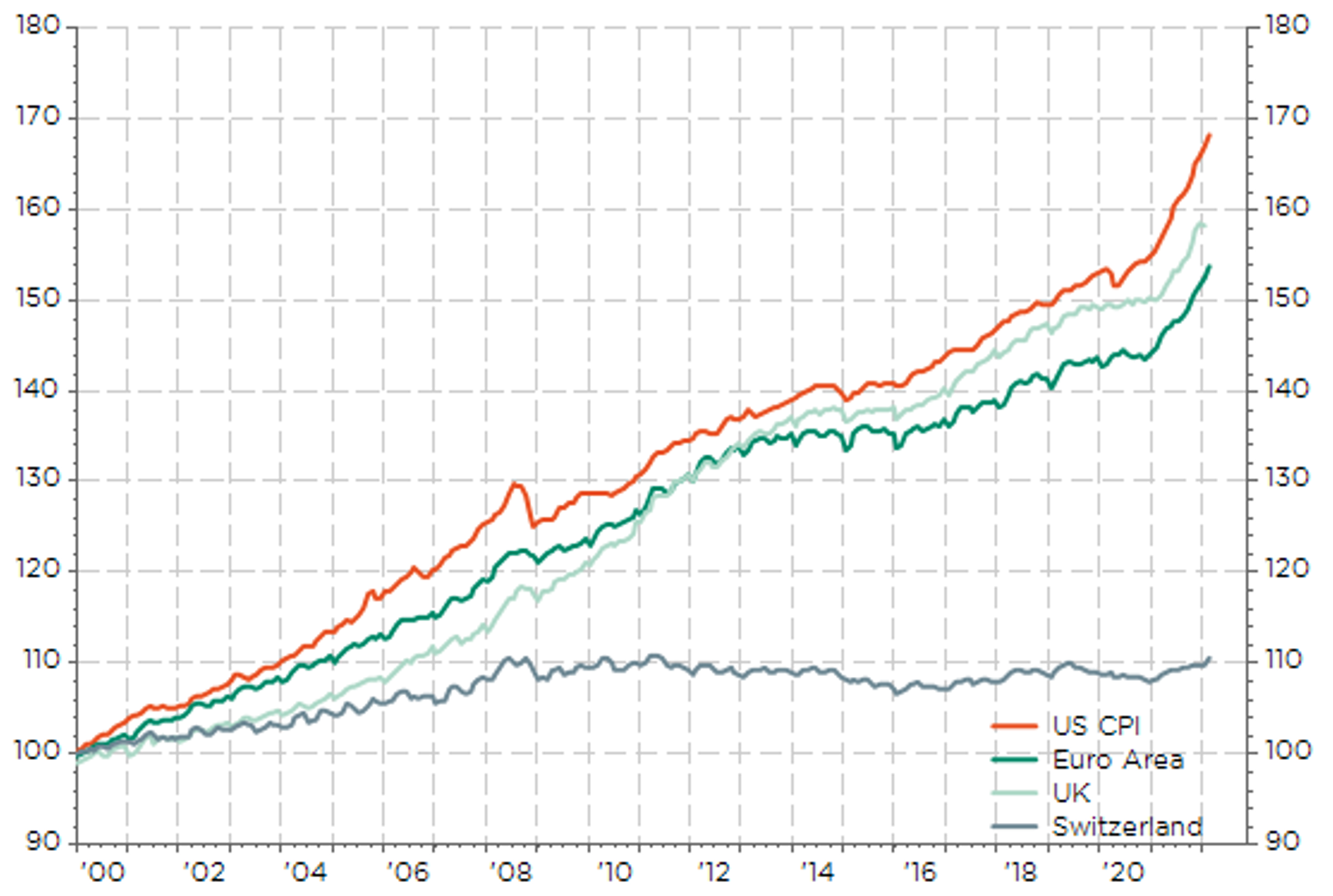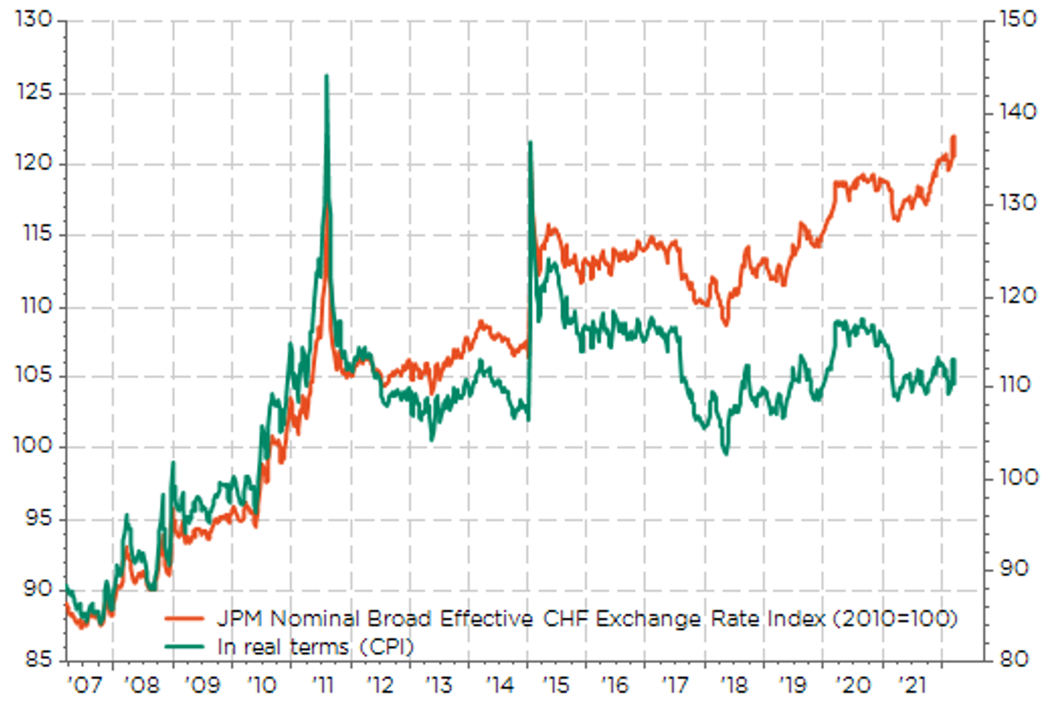 Come accade spesso in economia, vi è purtroppo la storia dell’uovo e della gallina tra la dinamica dell’inflazione e i trend valutari, poiché una valuta più debole/forte tenderà anche a esacerbare/soffocare le pressioni inflazionistiche in un processo che si autoavvera. Da qui, il potenziale dilemma per la Banca nazionale svizzera (BNS) se l’inflazione prende piede in Svizzera… Dovrebbe continuare a lamentarsi di un franco forte, che tra l’altro non è così vero in termini reali come mostrato qui sopra, o piuttosto apprezzare la sua forza, che sta tenendo a bada le pressioni inflazionistiche importate? Se la BNS appare ad un certo punto troppo attendista, soprattutto nel caso in cui la BCE normalizzi la sua politica monetaria più velocemente di quanto attualmente prezzato, il franco svizzero comincerà probabilmente a deprezzarsi in maniera considerevole con i rischi di sfidare ulteriormente la definizione di “stabilità dei prezzi” della BNS.