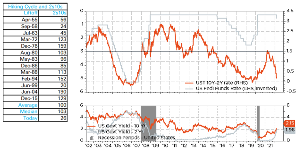 Sfortunatamente, la Fed sta per iniziare un ciclo di inasprimento con l’inclinazione della Yield Curve misurata come la differenza tra gli yield a 10 e 2 anni vicino al punto più piatto che ci sia mai stato (vedi sopra), il che non è di buon auspicio per la durata del ciclo in quanto una recessione di solito (cioè in media) segue 18 mesi dopo l’inversione della curva dei rendimenti… Tuttavia non intraprendere un ciclo di rialzo potrebbe rivelarsi più dannoso a lungo termine in fatto di incorporare in modo più strutturale le aspettative di inflazione nell’economia e di conseguenza necessitare di rimedi ancora più dannosi per contrastarle. Supponendo che le proiezioni economiche della Fed sulla crescita e l’inflazione siano “corrette”, sembra davvero difficile ridurre l’inflazione di quanto la Fed prevede senza azioni di politica monetaria più restrittive. Si aggiunga poi che Powell ha recentemente dichiarato Volcker il più grande funzionario pubblico dell’epoca… e probabilmente si capisce meglio perché i mercati stiano ora prezzando i rischi che possa dover agire come lui!