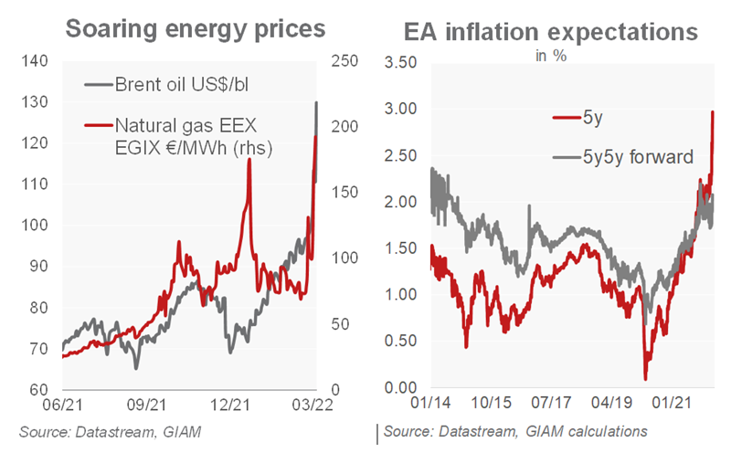 La conseguente spinta stagflazionistica sta intensificando i dubbi delle banche centrali. La BCE vuole evitare un errore politico come nel 2011, quando alzò i tassi prematuramente. Tuttavia, con l’inflazione che continua a superare il 5,8% a febbraio e le aspettative di un ulteriore aumento, la BCE è pronta ad annunciare la fine del programma PEPP. Ciò nonostante, l’elevata incertezza geopolitica le impedirà probabilmente di fissare una qualsiasi data per la fine del programma APP ed il rialzo dei tassi. La Fed è ancora sulla buona strada per definire la prossima settimana il primo rialzo dei tassi dal 2018, incoraggiata dal positivo rapporto sul mercato del lavoro di pochi giorni fa (con un incremento di 678k unità nell’occupazione non agricola a febbraio) e dall’inflazione di febbraio che probabilmente si confermerà intorno all’8%.