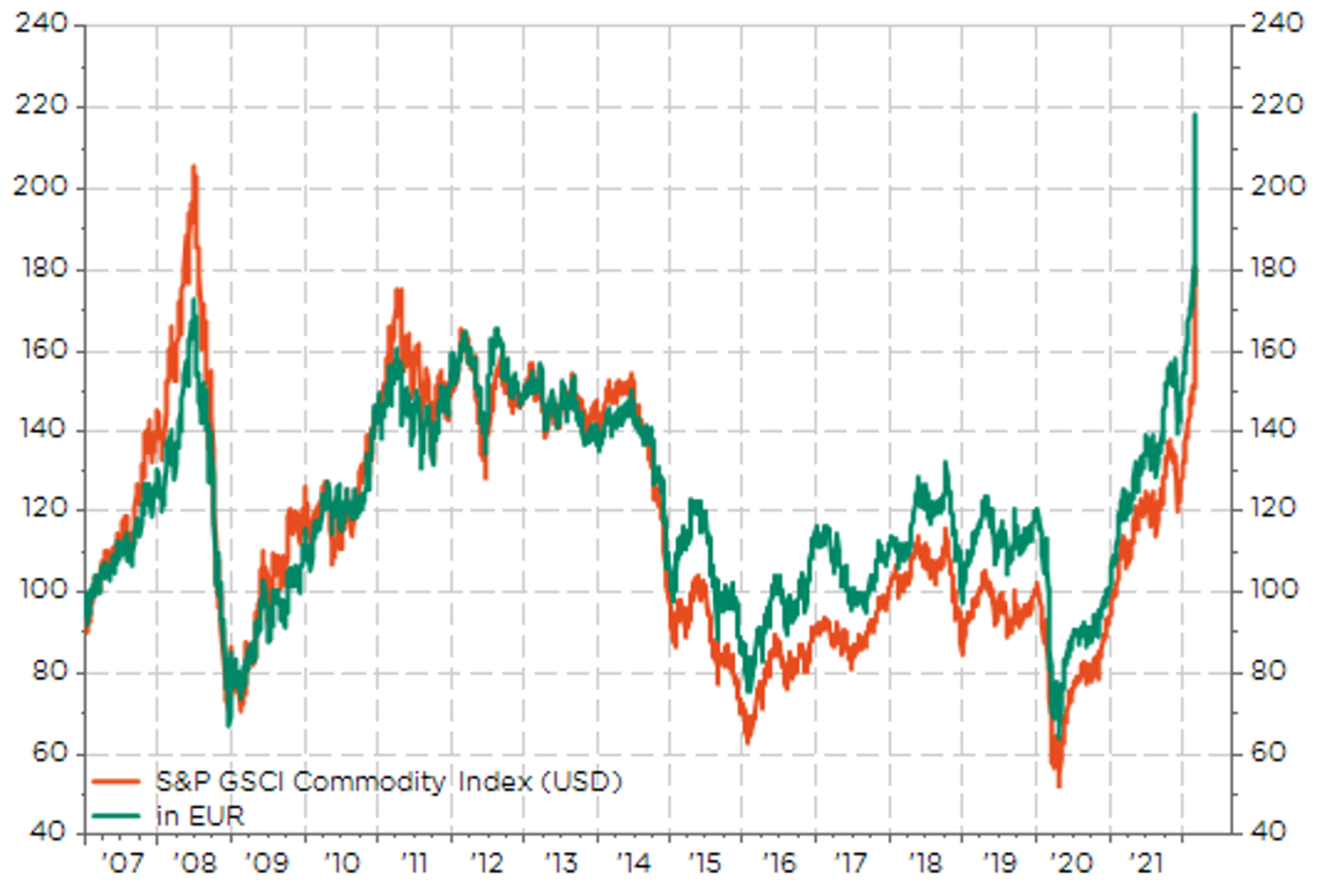 - Il rischio di inflazione sta diventando più ampio nell’Area Euro che negli Stati Uniti, con un aumento maggiore dei prezzi delle materie prime denominate in EUR che in USD, e una BCE che non può realmente agire
