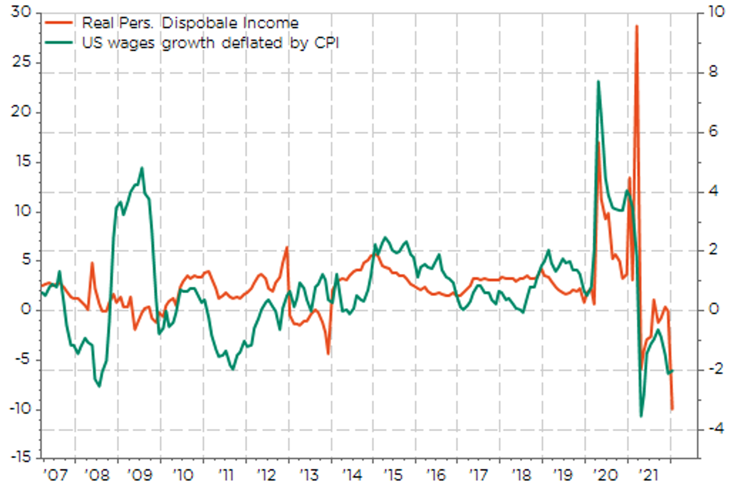 - L’economia statunitense è un po’ più isolata, ma non completamente al sicuro, poiché il sentiment dei consumatori statunitensi è già a un livello basso e la crescita dei salari reali è ora in territorio negativo.