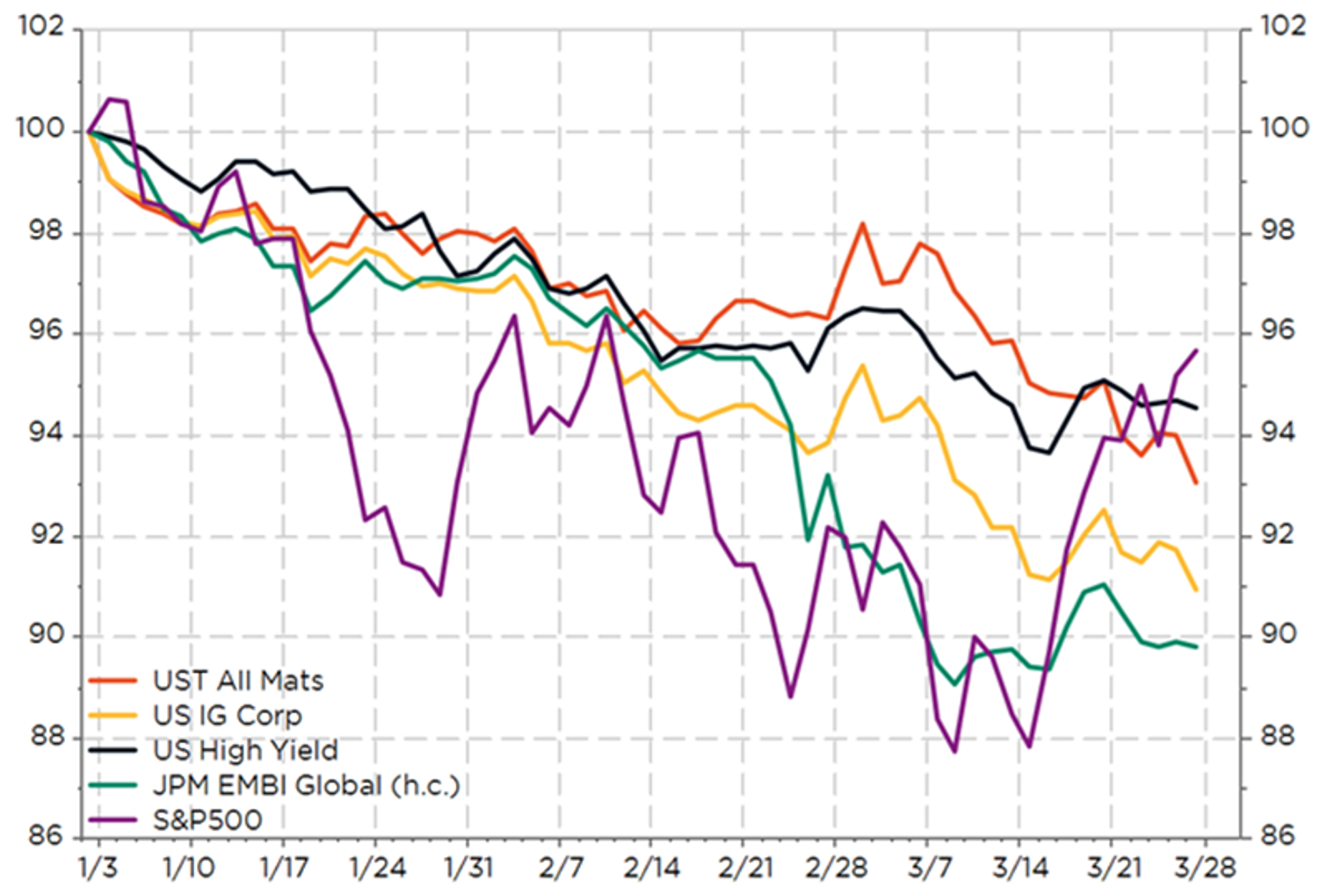 Rendimenti totali YTD dello S&P500 rispetto ai principali indici obbligazionari USA