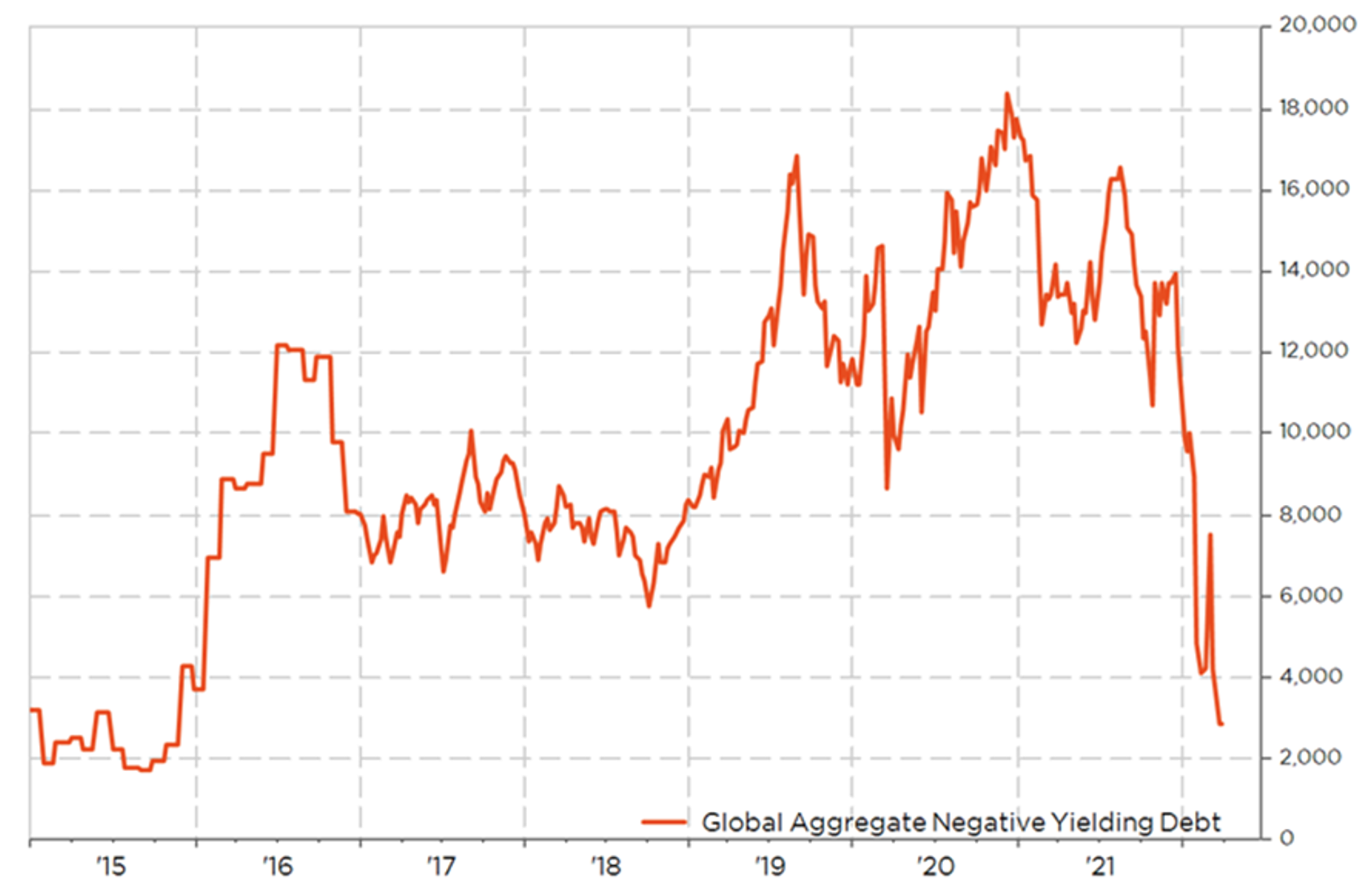 Di conseguenza, la maggior parte degli indici dei mercati azionari globali sono ora a livelli più alti di prima dell’invasione dell’Ucraina da parte della Russia… Negli Stati Uniti, lo S&P500 ha persino sovraperformato i principali indici di reddito fisso statunitensi su base YTD mentre le obbligazioni hanno continuato a soffrire, con i tassi a 10 anni ora sopra il 2,5% (livello più alto dal 2019). Bisogna tornare indietro fino al 1994 per osservare un simile mercato obbligazionario ribassista, che in realtà è già iniziato l’anno scorso. Ancora una volta, abbastanza sorprendentemente, all’interno dell’universo del reddito fisso, gli strumenti legati al credito come il debito High Yield o dei Paesi emergenti hanno sovraperformato ultimamente i treasuries “risk-free”… in assenza di “buone notizie”. L’unica buona notizia, almeno per gli investitori in obbligazioni a lungo termine come assicurazioni e fondi pensione, è che la quantità di debito a rendimento negativo si sta sciogliendo come neve al sole, offrendo ora rendimenti attesi più decenti, almeno in termini nominali ma probabilmente anche in termini reali, per i prossimi anni.