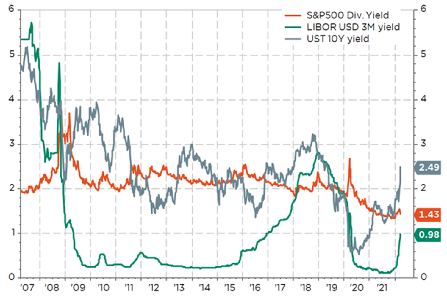 Nel frattempo, le azioni si stanno riprendendo nonostante una Fed restrittiva e le preoccupazioni per la stagflazione… Se ricordo bene, le azioni qualche mese fa non stavano realmente abbracciando la prospettiva di tassi (reali) più alti. Ma ora che lo scenario della Fed è diventato ancora più intricato, in quanto deve gestire un equilibrio molto delicato con l’aumento dell’inflazione e le incertezze geopolitiche, mentre normalizza la politica monetaria e i rischi al ribasso sulla crescita si accumulano, le azioni sembrano improvvisamente beneficiare di un rinnovato vento favorevole TINA (There Is No Alternative). Tanto più pericoloso in quanto le acrobazie equilibriste della Fed si svolgono ora senza una rete di sicurezza, dato che la “Fed put” è stata chiaramente fissata più in basso dallo stesso Jerome Powell durante la sua ultima conferenza stampa. La Fed parla di combattere l’inflazione, i tassi e i prezzi delle materie prime in aumento, l’andamento dei dividendi sta morendo e… il mercato azionario sembra gradire!
