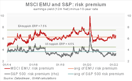 Mentre la crisi ucraina si sta inasprendo, i mercati hanno registrato un calo del 10% rispetto al picco di novembre. La situazione rimane fluida, con il divieto SWIFT e le sanzioni verso banca centrale russa che marcano una chiara escalation. Nel breve termine, escludendo i forti ribassi registrati nella grande crisi finanziaria e durante la crisi Covid nel 2020 e guardando ai rimanenti picchi passati nei premi per il rischio (equity risk premium o ERP, al 7,5% per l’indice MSCI EMU ed al 4,5% per l’indice S&P500) riteniamo che vi sia spazio per un altro 5%-10% circa di ribasso. Storicamente questi picchi nell’ERP sono stati generalmente di breve durata e hanno rappresentato in media opportunità di acquisto. Troviamo lo stesso ordine di grandezza di ribasso potenziale osservando i momenti di maggiore sconto dei prezzi degli indici rispetto al nostro indicatore di Fair Value: questo approccio indica un ulteriore ribasso di circa il 5%-7% per raggiungere il discount registrato nei periodi di elevata avversione al rischio.