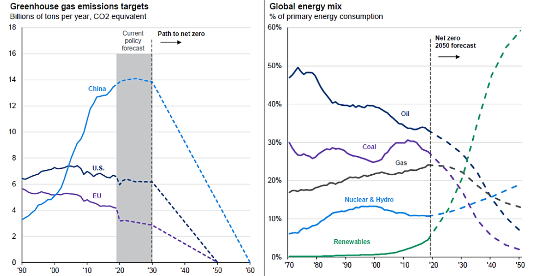 Tra gli altri, lo scorso Gennaio i paesi dell’UE hanno raggiunto l’accordo su una proposta della Commissione Europea per investire circa 1.037 miliardi di euro in 5 progetti infrastrutturali transfrontalieri nell’ambito del CEF, ovvero il Connecting Europe Facility. La maggior parte del finanziamento andrà al progetto EuroAsia interconnector, a sostegno di un’interconnessione elettrica alimentata anche da fonti di energia sostenibile. Tra infrastrutture e nuove tecnologie, inoltre, la transizione richiederà una grande quantità di materiali ed i maggiori player del settore dell’estrazione mineraria si stanno preparando per espandere la propria capacità produttiva: tra le altre, Rio Tinto ha offerto circa $2,7 miliardi di dollari per acquisire il restante 49% di Turquiose Hill, che a sua volta controlla Oyu Tolgoi. Quest’ultima è un’azienda mineraria operante nel deserto del Gobi in Mongolia che, secondo alcuni esperti, potrebbe diventare la quarta miniera di rame più grande del mondo entro il 2030. L’obiettivo di Rio Tinto sarebbe quello di aumentare la produzione di materie prime come rame, litio e alluminio per ricoprire un ruolo chiave nella transizione dai combustibili fossili. E quali sono, in particolare, le principali fonti di energia pulita su cui l’economia futura potrà fare affidamento? I focus principali saranno solare ed eolico. Ad esempio, sempre nel deserto del Gobi, la Cina sta esplorando un’interessante opportunità: il Governo sta pianificando di costruire una capacità produttiva di energia solare ed eolica, corrispondente a circa 450 GW (gigawatts), da completarsi entro il 2030. Un progetto di questa portata equivarrebbe a più del doppio della capacità ad oggi installata negli Stati Uniti. Alla luce di ciò, dunque, si ritiene che il tema della transizione energetica non dovrebbe mancare in un portafoglio azionario e, visti i ribassi generalizzati sui mercati, potrebbe essere un buon momento per mediare gli investimenti a prezzi più bassi.