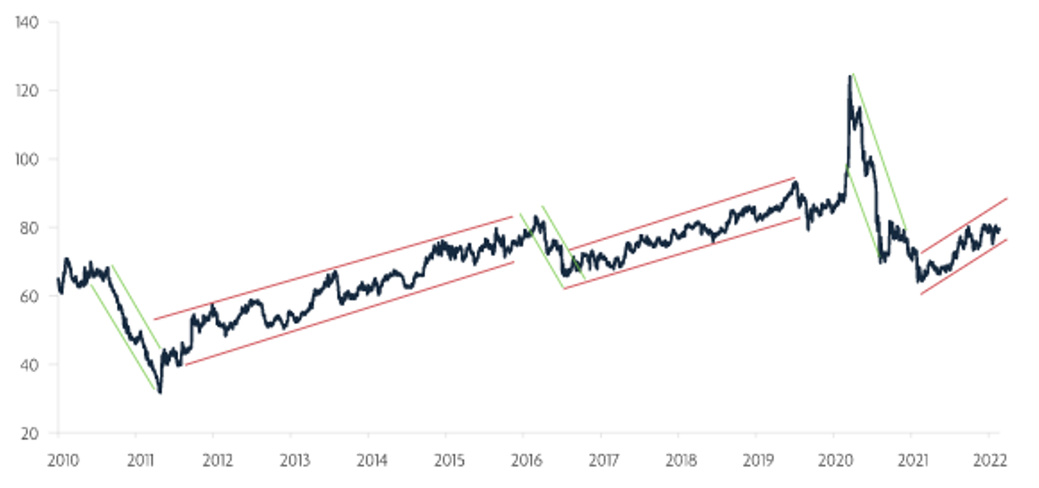 Le società minerarie hanno sofferto durante un anno e mezzo di inversione del prezzo dell’oro denominato in dollari (tra la fine del 2020 e il febbraio 2021). I loro margini operativi si sono ridotti a fronte dell’aumento dei costi dei fattori produttivi. Questo ha colpito le società minerarie dell’argento più di quelle d’oro, in quanto i primi hanno margini operativi per natura più bassi e quindi una maggiore sensibilità ai movimenti del prezzo della materia prima.