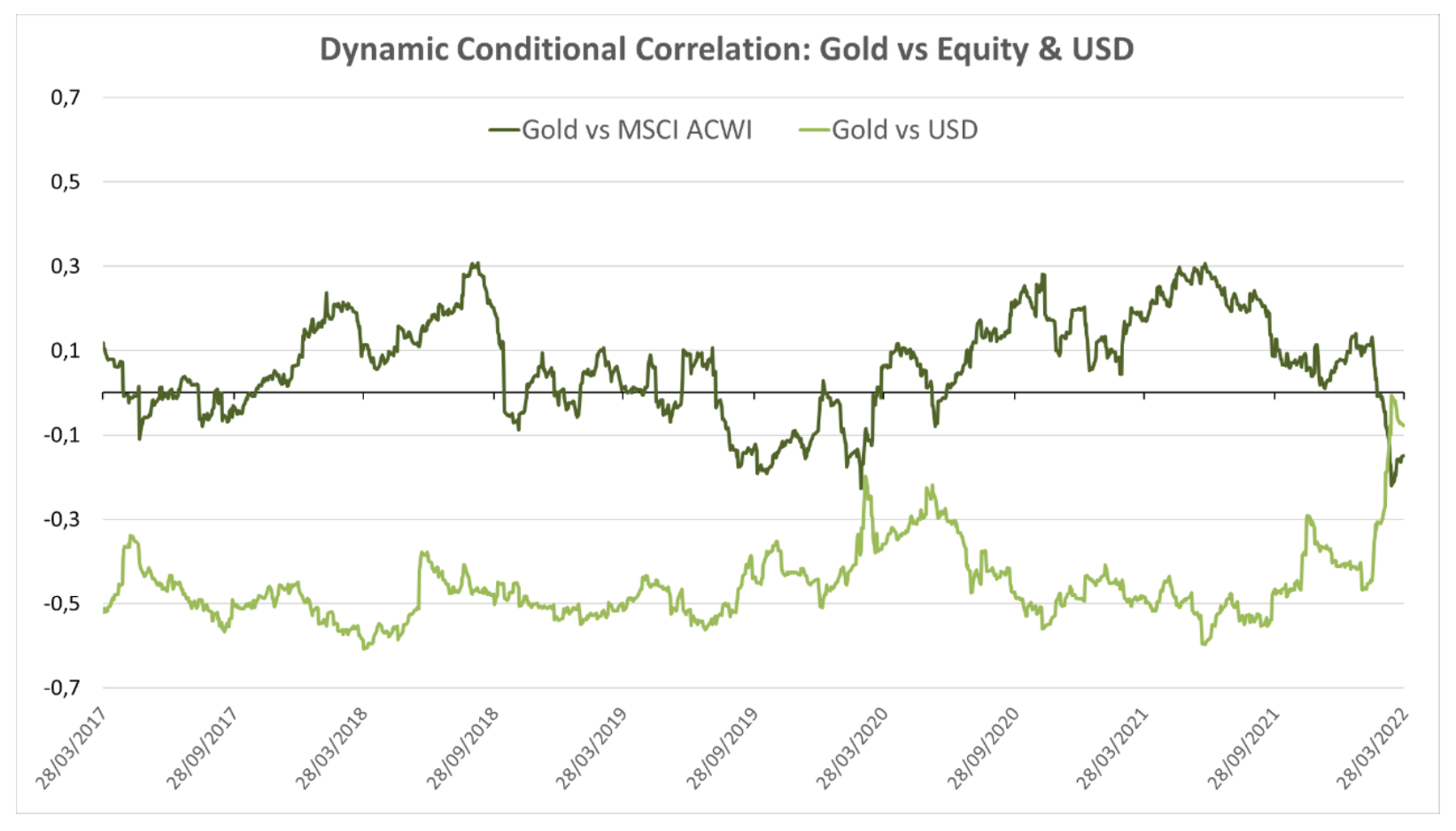 Il prezzo dell’oro ha accelerato al rialzo dallo scorso fine gennaio – quando quotava circa 1790 dollari all’oncia – arrivando a toccare i 2050 dollari l’oncia ad inizio marzo per poi attestarsi stabilmente sopra i 1900 dollari l’oncia. In particolare, nello stesso periodo, l’oro ha evidenziato una correlazione con l’equity passata da positiva a negativa e una correlazione con il dollaro USA in diminuzione in termini assoluti, passando da circa -45% alla neutralità, come evidente nel grafico: