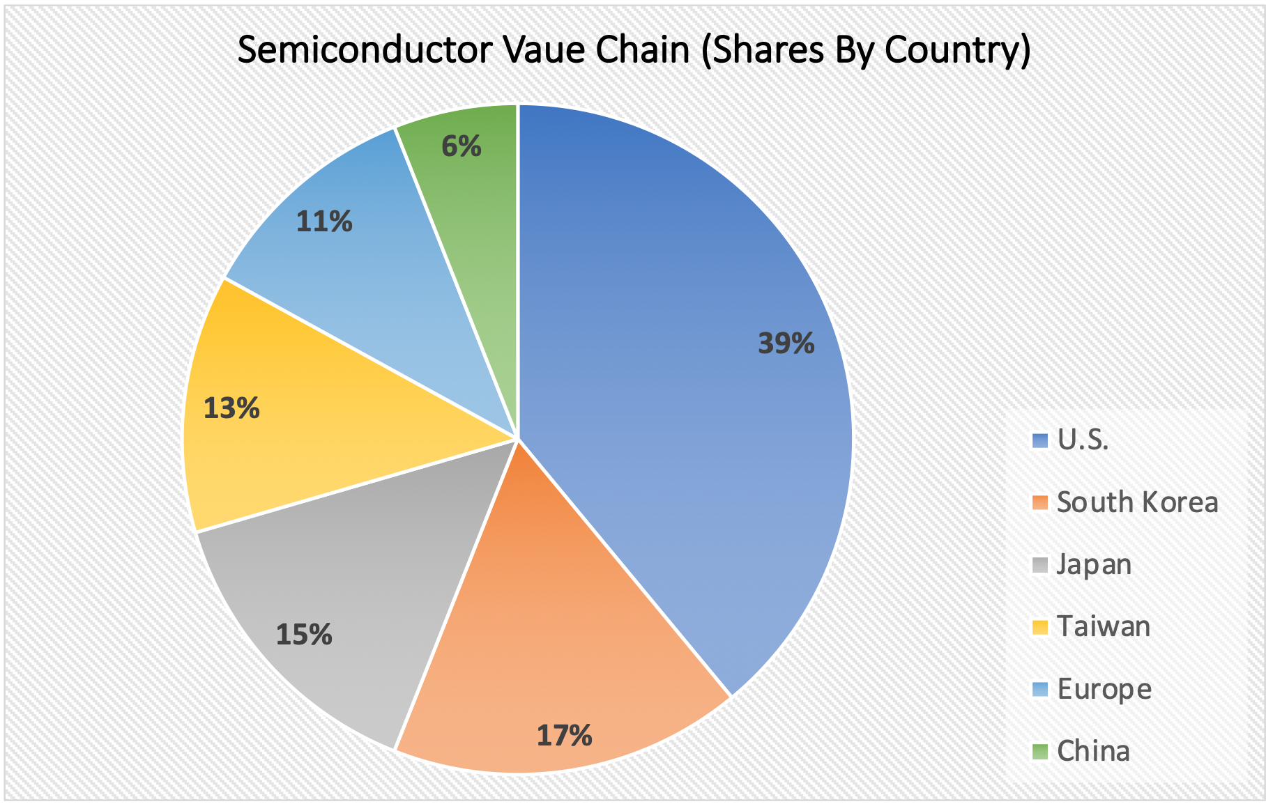 Gli Stati Uniti detengono la prima o la seconda posizione in quasi tutti i segmenti principali di questa value chain (eccetto la produzione di wafer) e, nonostante sia entrata in gioco tardi, la Cina è ora un player importante in quasi tutti i segmenti. Tuttavia, il paese ha davanti a sé una lunga strada da percorrere per recuperare il ritardo nei confronti degli Stati Uniti, basti pensare che al momento ha una quota di mercato di circa il 6%, a differenza del 39% degli USA.