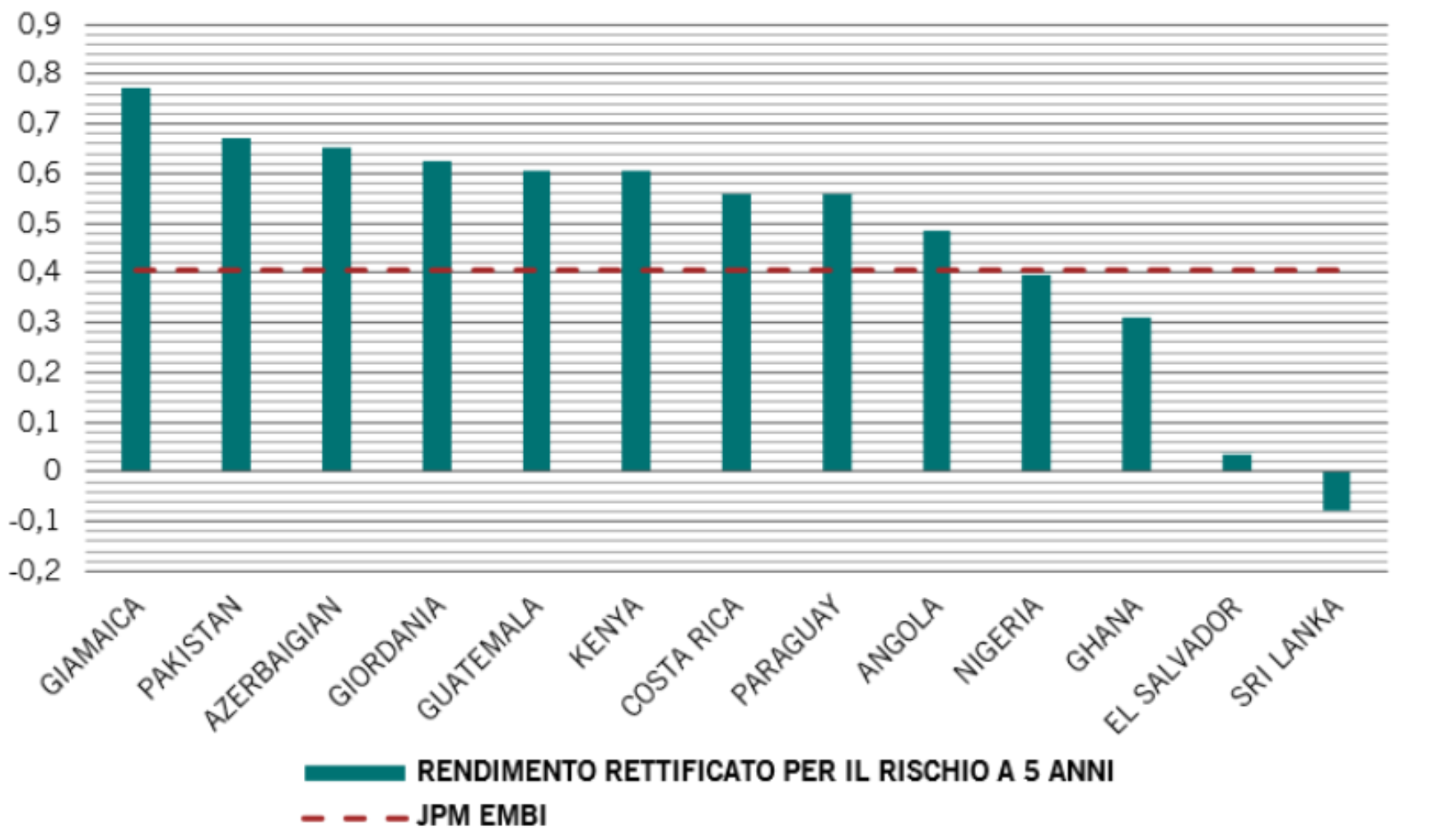 Rendimenti delle obbligazioni di frontiera (JPM Nexgem) vs JPM EMBI, rendimenti annuali rettificati per il rischio a cinque anni*