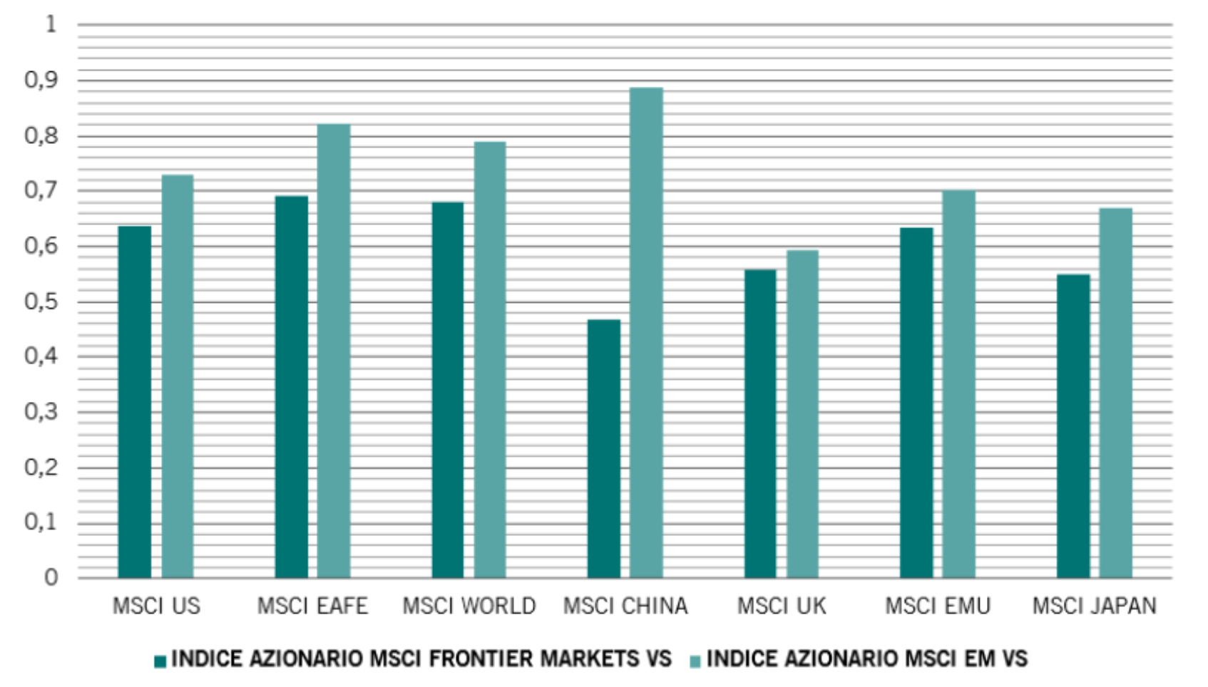 Correlazioni a 5 annitra gli indici azionari MSCI Frontier Markets e MSCI EM con altri indici azionari