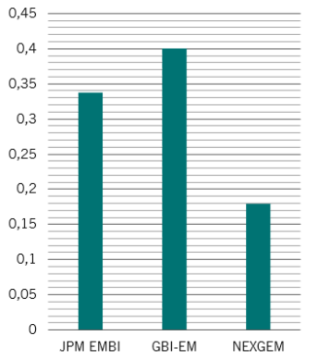 Un altro fattore fondamentale da considerare è rappresentato dalla bassa correlazione che i mercati di frontiera hanno con le principali classi di attività rispetto agli strumenti dei mercati emergenti. Ciò li rende un’utile fonte di diversificazione. Ad esempio, la correlazione decennale tra il rendimento dell’indice azionario MSCI ACWI World Equities e quello delle azioni dei mercati di frontiera è stata pari a 0,6, mentre quella con le economie dei mercati emergenti è stata 0,8 (si veda la Fig. 6). La storia è simile nel reddito fisso: dal 2019 la correlazione tra l’indice obbligazionario dei mercati di frontiera JPM Nexgem e le obbligazioni globali è stata pari a 0,18, quella tra JPM EMBI e obbligazioni globali 0,34 (si veda la Fig. 7).
