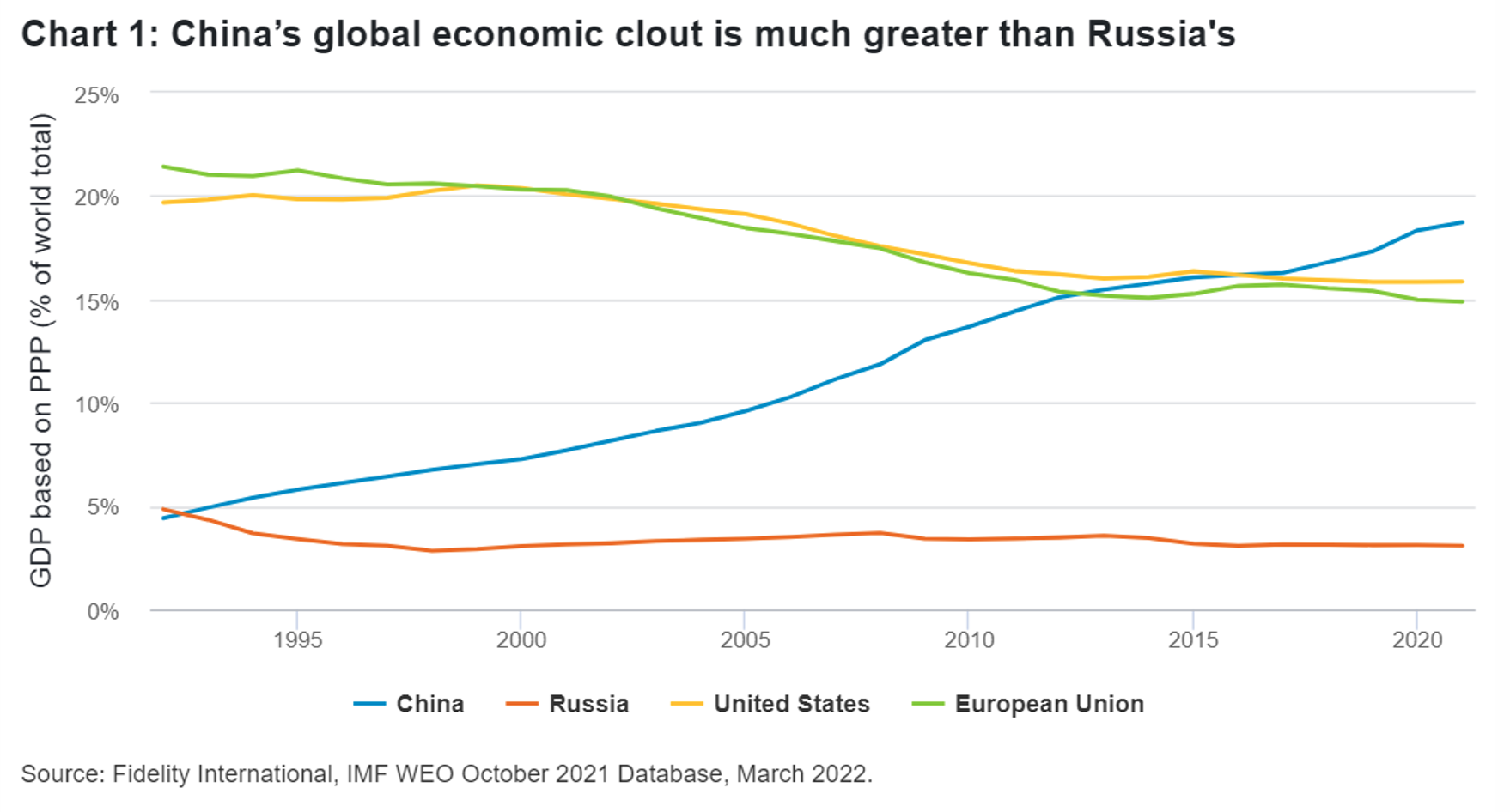Ad ogni modo l’interdipendenza tra la Cina e le altre nazioni rimane elevata. È importante sottolineare che la Cina è nettamente più integrata nell’economia mondiale rispetto alla Russia, e che l’interdipendenza della Cina con i mercati sviluppati ha radici molto più profonde. In termini di quota percentuale del PIL mondiale a parità di potere d’acquisto, la Cina rappresenta il 18,7% rispetto al 3,1% della Russia. A livello commerciale, la differenza è ancora più marcata. La quota cinese delle esportazioni mondiali rappresenta il 14,2% in termini di valore rispetto al 2,2% per la Russia. Per quanto riguarda le importazioni, le quote sono del 10,5% e dell’1,2% rispettivamente.