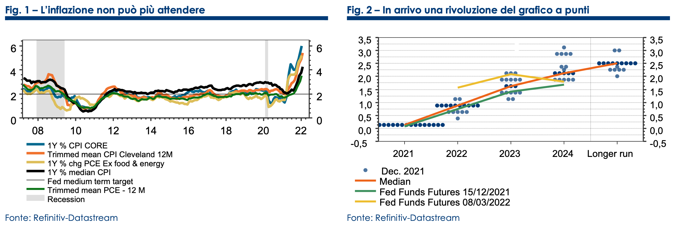 Nelle proiezioni macro, il FOMC dovrebbe rivedere nettamente verso l’alto l’inflazione a fine 2022, e verso il basso il tasso di disoccupazione. Per il 2023, si dovrebbe segnalare un’inflazione core ancora sopra il 2% e un tasso di disoccupazione sempre sotto il livello di più lungo termine, con un probabile ritorno al 2% del deflatore core nel 2024. Con questo scenario, la mediana dei tassi dovrebbe incorporare rialzi vicini a 1,5pp nel 2022. Un elemento cruciale sarà il punto di arrivo atteso per il 2023, che potrebbe essere vicino alla neutralità (2,5%). I toni della conferenza stampa potrebbero essere hawkish, soprattutto se le previsioni dei tassi si fermeranno al livello neutrale.