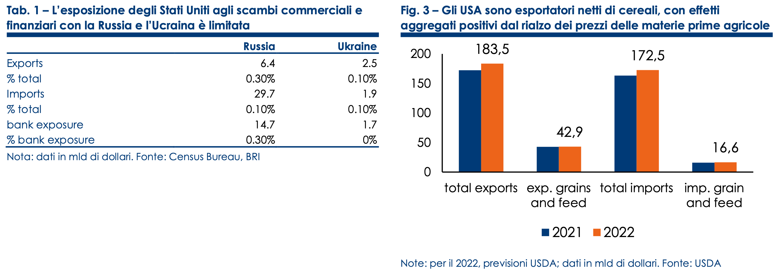 Gli Stati Uniti dovrebbero risentire in misura limitata delle ripercussioni dirette della guerra in Ucraina in termini di crescita, grazie alla scarsa esposizione commerciale e finanziaria verso la Russia e ai flussi internazionali netti di materie prime energetiche e agricole. Lo shock dovrebbe essere assorbito senza far deragliare la ripresa e probabilmente anche senza modificare in misura sostanziale lo scenario di rimozione dello stimolo monetario atteso prima dell’invasione russa dell’Ucraina.