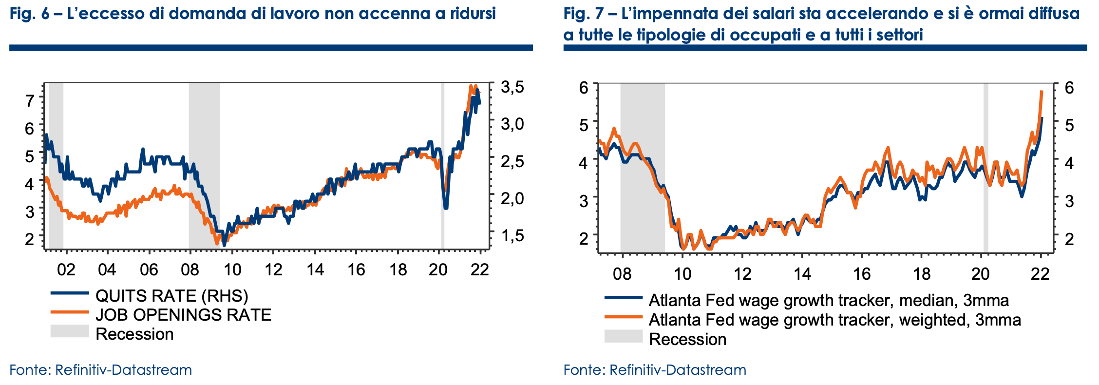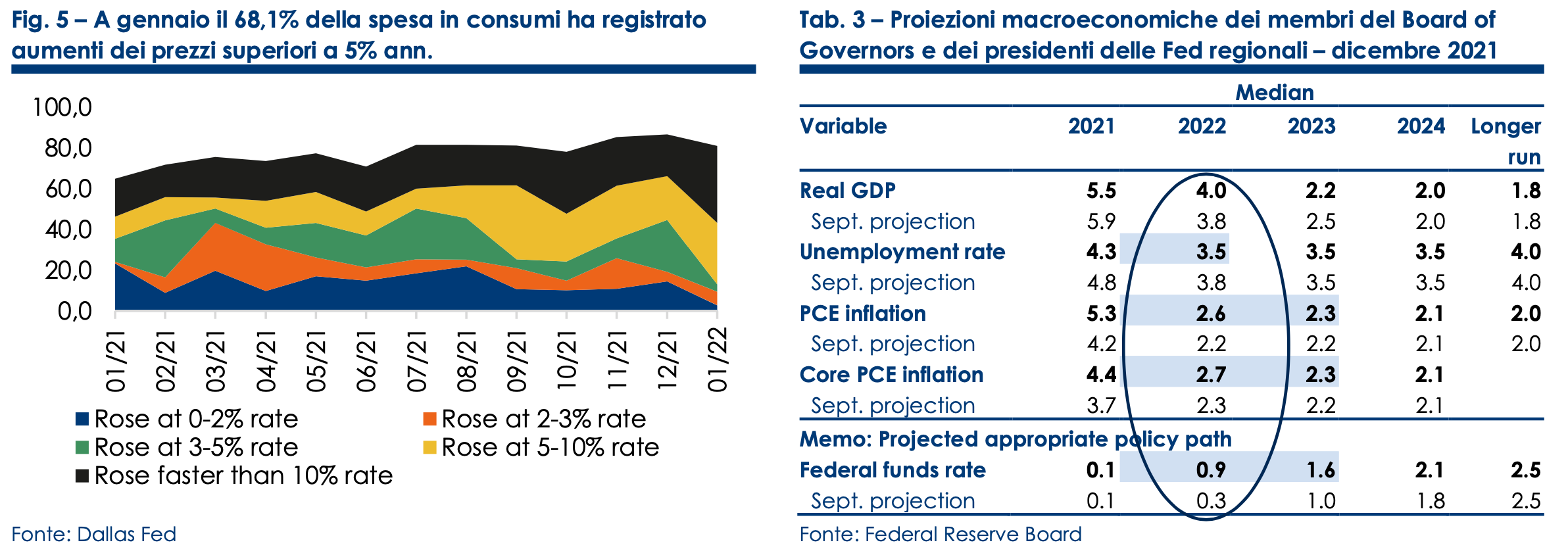 Un elemento cruciale delle nuove previsioni sarà il punto di arrivo, che a dicembre era atteso a 2,25%, poco sotto la neutralità. La conferenza stampa dovrebbe sottolineare la condizionalità delle previsioni all’andamento dell’inflazione nella seconda metà dell’anno, e ribadire i rischi di trasmissione dell’inflazione più elevata ai salari. Per la Fed sarà difficile alzare i tassi e portarli potenzialmente in territorio restrittivo, ma le condizioni di partenza in questo ciclo sono particolarmente rischiose per un eventuale disancoraggio delle aspettative. L’inflazione è non solo elevata e in ulteriore aumento, ma anche diffusa alla maggior parte dei settori (v. Figg. 1 e 5). L’eccesso di domanda di manodopera, difficilmente risolvibile nel corso del 2022, amplifica i rischi attraverso la spirale salari/prezzi già in atto.