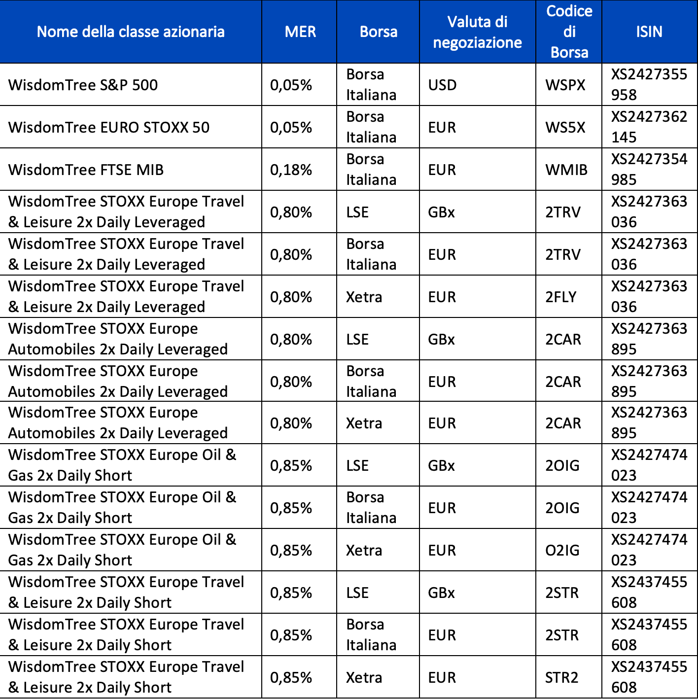 Alexis Marinof, Head of Europe, WisdomTree ha aggiunto: “In qualità di leader europeo negli ETP short e con leva, rimaniamo impegnati a fornire agli investitori la più ampia gamma di strumenti di trading tattico disponibile sul mercato. Il lancio di questi nuovi prodotti, appositamente progettati per aiutare gli investitori a muoversi in mercati finanziari dinamici e in contesti economici difficili, completa la nostra gamma di soluzioni già in essere. Continueremo ad adottare un approccio attento allo sviluppo dei prodotti e a cercare opportunità per offrire le esposizioni che gli investitori desiderano avere nei loro portafogli”.