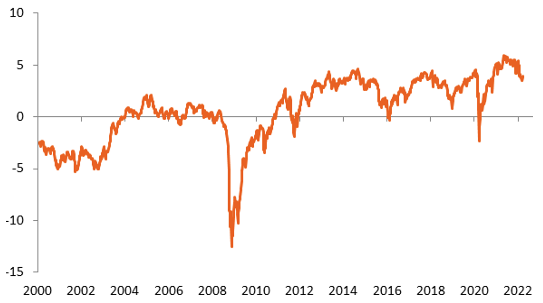 Di fronte a questi dati, uniti a un tasso di disoccupazione e a richieste di lavoro contenuti, la Fed non ha avuto altra scelta che inasprire la propria posizione, annunciando più di 200 pb di rialzi dei tassi previsti nel 2022 e altri 75 pb nel 2023 (secondo Markit).