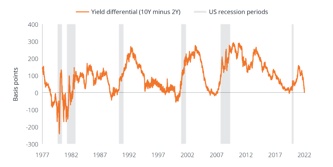 Dopo l’annuncio delle intenzioni restrittive della Fed, la prospettiva di avere una curva dei rendimenti invertita (in cui il debito a più breve scadenza rende di più del debito con scadenze più lunghe) è diventata molto più probabile. In effetti, l’inversione dei rendimenti dei titoli di Stato statunitensi a 2 e 10 anni, si è verificata alla fine di marzo/inizio di aprile. In passato il divario negativo è stato spesso foriero di una recessione, anche se vi sono stati alcuni segnali errati quando si è manifestato troppo presto. Si è registrata comunque un’inversione prima di ogni recessione, dalla Seconda guerra mondiale in poi.