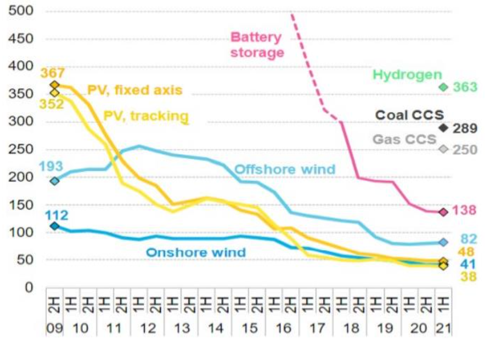 La transizione verso l’energia pulita è necessaria anche dal punto di vista economico. Le rinnovabili sono ormai la forma più economica di generazione di nuova elettricità in circa il 90% del mondo e la recente impennata dei prezzi dei combustibili fossili ne migliora ulteriormente la competitività relativa in termini di costi (Figura 2). Inoltre il costo della mancata mitigazione del cambiamento climatico porterebbe a un’erosione del PIL annuale superiore al 3% entro il 2030. Infine, nel lungo periodo, il passaggio alle rinnovabili implica che governi e società non saranno più esposti alla volatilità dei prezzi delle materie prime, con evidenti benefici sociali.