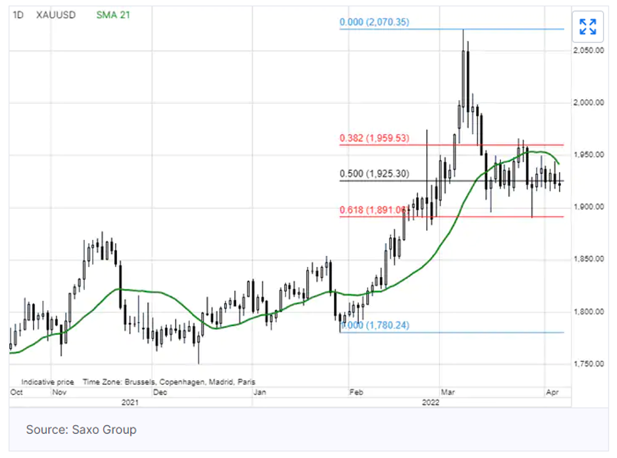 L’oro (XAUUSD) staziona in un intervallo relativamente ampio tra 1890 e 1960 dollari. Due giorni fa, un altro tentativo di rialzo è stato contenuto malgrado i commenti aggressivi di Lael Brainard, membro del consiglio dei governatori della Fed Lael sul ritmo degli aumenti dei tassi e dell’inasprimento quantitativo, che dovrebbero iniziare nella riunione del FOMC del 4 maggio. Le sue parole hanno contribuito a far salire nettamente i rendimenti dei titoli del Tesoro USA e anche il dollaro è salito. I rendimenti reali a dieci anni hanno raggiunto il massimo su due anni a -0,21%, in rialzo dal -1,1% di inizio anno, con il mercato che ora sconta quasi dieci rialzi dei tassi di 25 pb nei prossimi dieci mesi.
