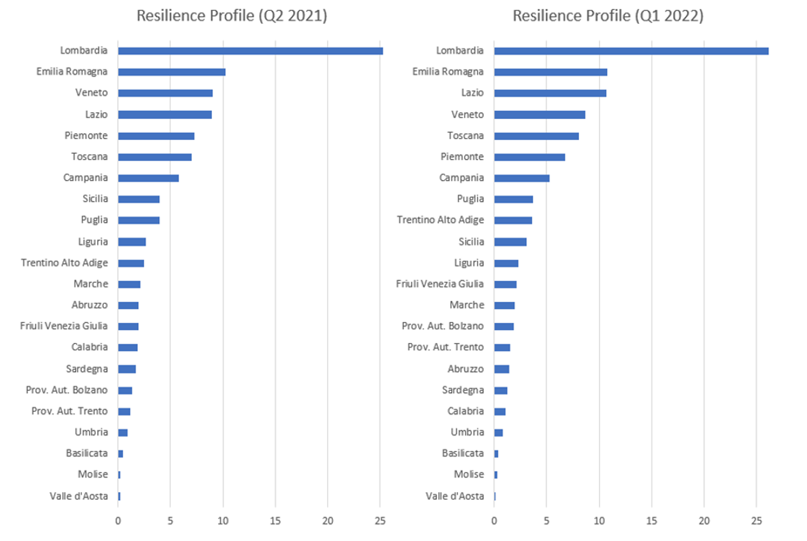 Rispetto al primo trimestre 2021, la Lombardia ha aumentato la propria impronta di resilienza, dal 25% al 26%. Lo stesso si può dire dell’Emilia Romagna così come del Lazio e della Toscana. Queste quattro regioni sono quelle che hanno avuto un impatto negativo sulla resilienza dell’Italia nell’ultimo anno. È interessante notare come il PIL della Lombardia sia il 22% di quello italiano ma il suo impatto sulla resilienza sia del 26%.