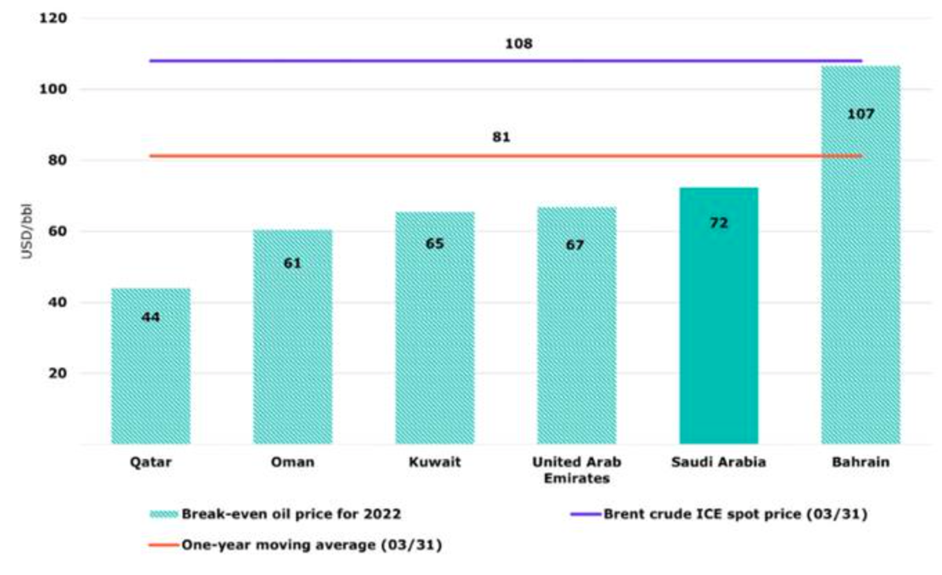 Le aspettative del regno in merito a un avanzo di bilancio erano evidenti già alla fine dello scorso anno, quando l’Arabia Saudita ha rivisto al rialzo le sue previsioni sulle entrate pubbliche ancor prima che l’invasione russa dell’Ucraina provocasse un’impennata dei prezzi del petrolio. Le entrate petrolifere continuano a dominare l’economia saudita e quelle di altri paesi del Golfo. I dati del governo rivelano che i livelli di breakeven per l’Arabia Saudita sono molto più bassi delle attuali quotazioni del greggio, e i possibili aumenti dei prezzi di vendita ufficiali segnalano la possibilità di un notevole beneficio per i conti pubblici.