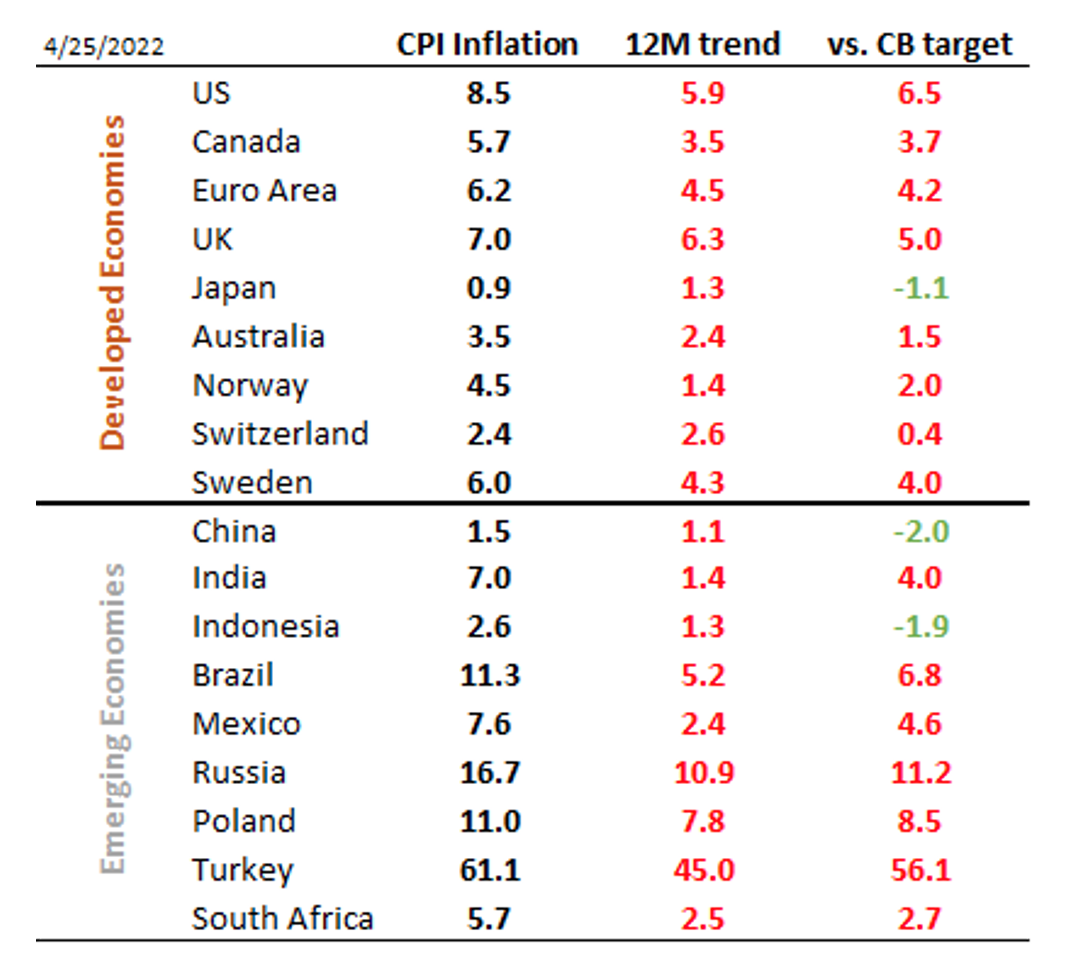 Livello d’inflazione, tendenza e deviazione dall’obiettivo delle banche centrali: più alto per più tempo quasi ovunque
