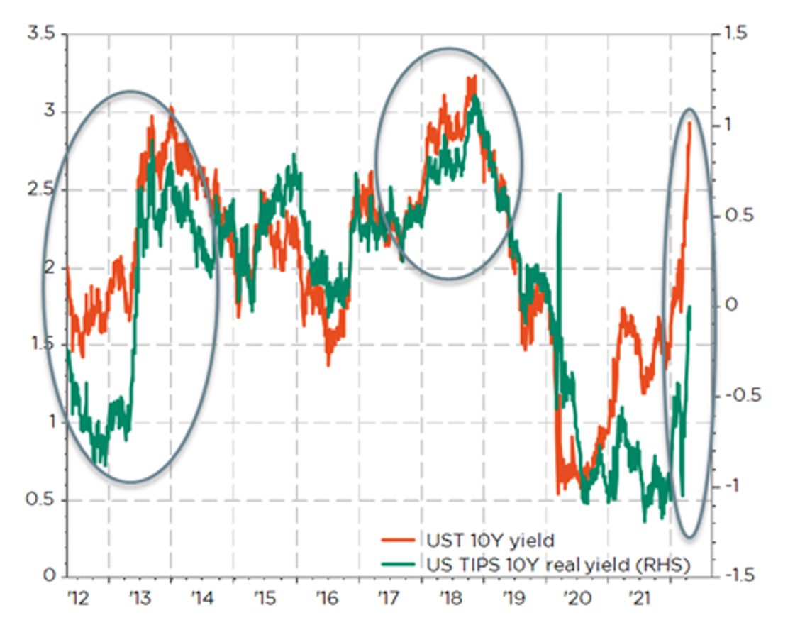 In terzo luogo, non mi aspettavo che le Banche Centrali adottassero una retorica così restrittiva. In particolare, ci si aspettava che i tassi di interesse reali rimanessero in ambito negativo nel nostro scenario di base. Tuttavia, la tendenza della politica monetaria si sta chiaramente spostando in territorio restrittivo, poiché l’inflazione è diventata il nemico pubblico n°1 per famiglie, classe politica e quindi banchieri centrali. I tassi reali (e nominali) degli Stati Uniti sono aumentati molto più velocemente del previsto e ora sono già vicini allo 0, poiché la posizione da falco della Fed si è trasformata in un atteggiamento restrittivo e presto opererà con diversi aumenti di 50bps nei prossimi mesi. Inoltre, il QT (Quantitative Tightening) inizierà il mese prossimo con un ritmo di deflusso del bilancio di 95 miliardi di dollari al mese (60 miliardi di dollari di UST e 35 miliardi di dollari di MBS), assorbendo la liquidità in eccesso. Di conseguenza, la cautela è giustificata dal fatto che la liquidità viene assorbita: “Solo quando la marea se ne va si scopre chi ha nuotato nudo” (Warren Buffet) e, di conseguenza, il Chuck Prince di oggi dovrebbe smettere di ballare (“Quando la musica si ferma, in termini di liquidità, le cose saranno più complicate”)