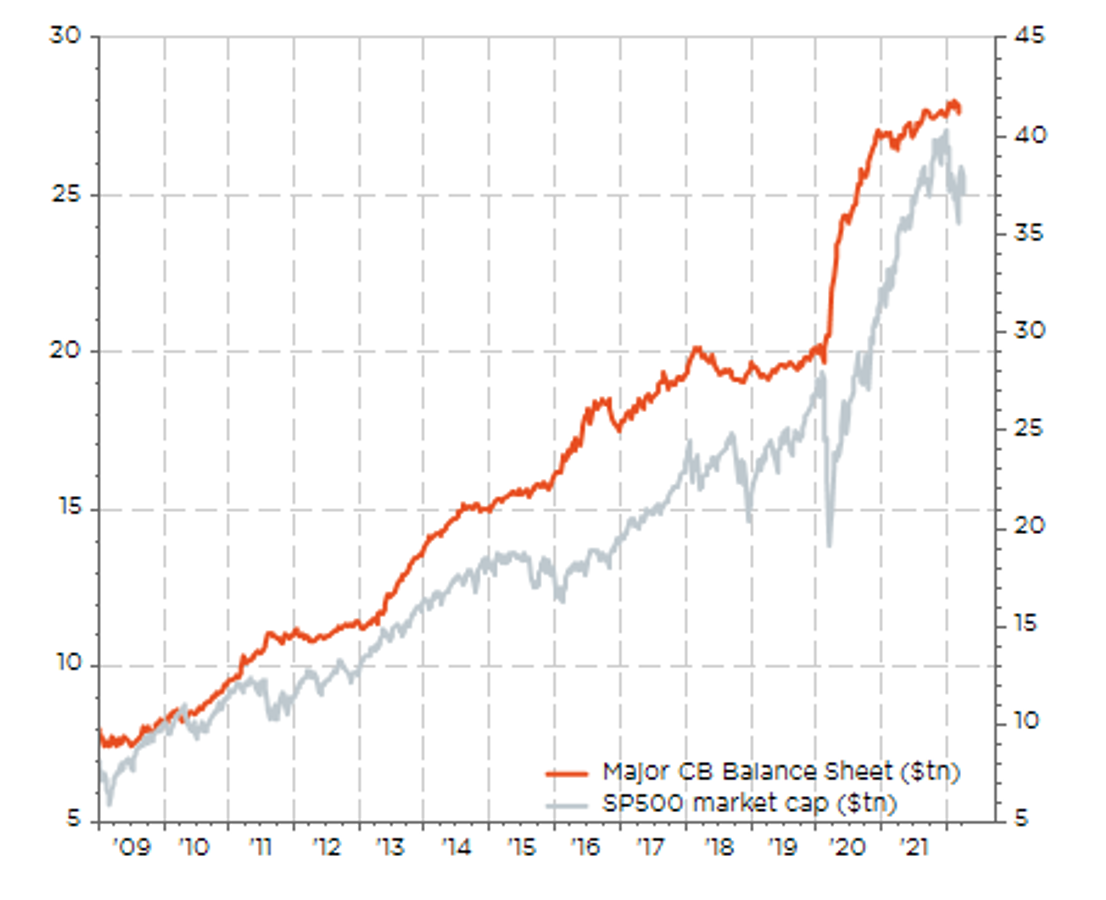 Bilancio delle principali BC e market cap dell’S&P500 (entrambi in $tn): non guardate in basso!