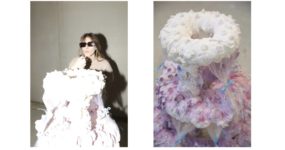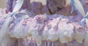 Con paso felpato cammino verso l’ultima sala che si affaccia al giardino di Palazzo Parigi. Anche il balcone è affollato: fumo e sigarette da rotolare con tabacco Pueblo. Distolgo lo sguardo e mi concentro sull’opera di Alice Pilusi intitolata Sorry I bit you when I was drunk, una torta di ceramica smaltata, nastro di raso e tulle su un tavolo ovale a specchio nero. Ricordo i lussuosi dolci in vetrina che scorro con lo sguardo ogni volta che camino su Via Montenapoleone. Le insegne dorate che recitano Marchesi preannunciano i centinaia di euro che devi pagare per una loro prelibatezza se vuoi celebrare come quelli che contano a Milano. Ma nell’opera di Pilusi ciò che poteva essere stucchevole viene completamente ribaltato.