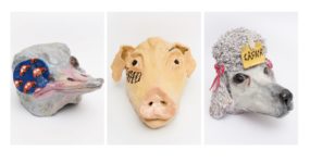 Rileggo il paragrafo e con questa nuova chiave di lettura mi avvicino a un’altra sala. Un tavolo shabby chic è tappezzato di erba sintetica, verde sgargiante, su cui si adagiano piccoli cagnolini di terracotta dipinti ad olio (come quelli che potresti vedere nelle vie di Milano dentro una borsa Louis Vuitton). Si tratta dell’installazione di Ludovica Gugliotta intitolata Non ironicamente stanche.