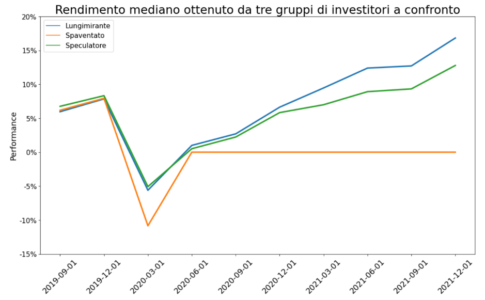 Per dimostrare i risultati concreti di questi tre comportamenti adottati durante la pandemia, Moneyfarm ha paragonato la performance mediana dei portafogli di questi clienti in una finestra temporale che va da gennaio 2019 a dicembre 2021:gli investitori Lungimiranti hanno ottenuto un rendimento mediano del 16,8%, gli Speculatori un rendimento del 12,8%, mentre gli Spaventati sono usciti con un 3,2%.